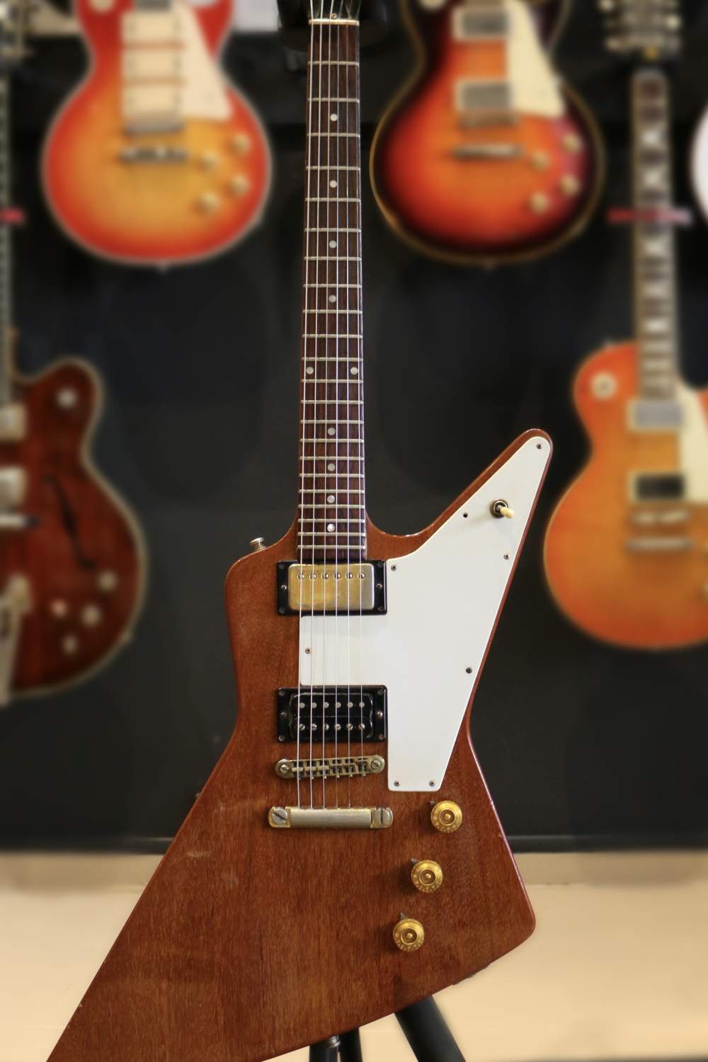 Guitare Collection vous présente cette rare Gibson Explorer Mahogany Natural Limited Edition de 1976, première année de réédition de ce superbe modèle :