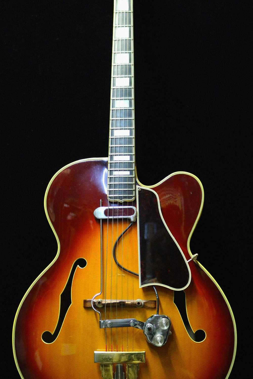 Livrée en Hardcase original, il s'agît d'une très rare L5 C exclusivement acoustique. Le propriétaire a installé par la suite un module DeArmond des 50's, mais aucunes modifications n'ont été aportéés pour adapter ce module, et celui-ci peut être retiré très facilement.