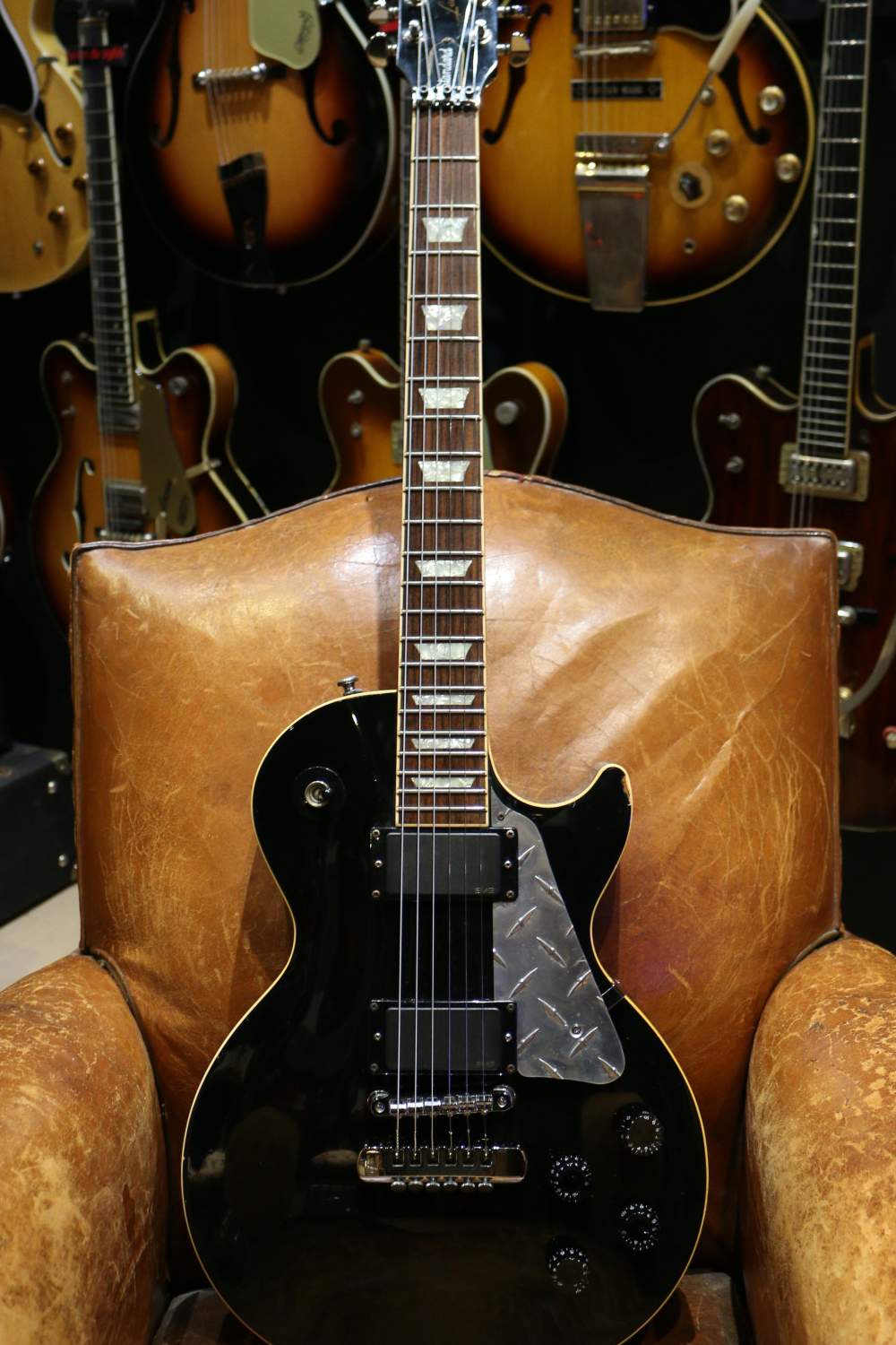Tout le hardware (sauf les mécaniques Grover) a été changé et remplacé par un chevalet TonePros, un cordier style Gibson TP-6 ainsi qu’un sillet à blocage. Le pickguard est une plaque de métal « diamant » et les boutons de potentiomètres sont des speedknobs.