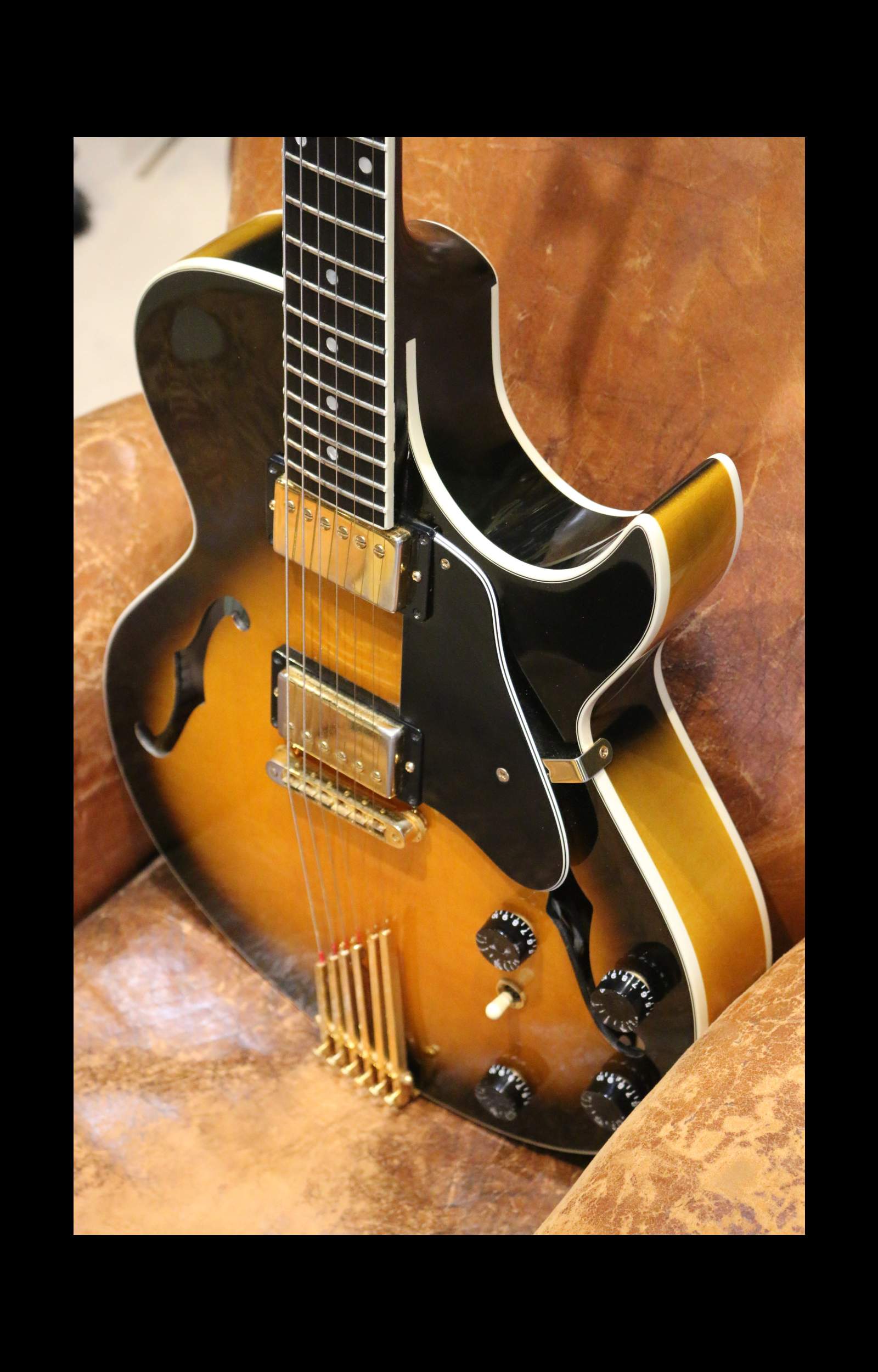 Inspirée des modèles jazz traditionnels comme l’ES-175, elle intègre une poutre centrale qui réduit le larsen tout en conservant chaleur et sustain.