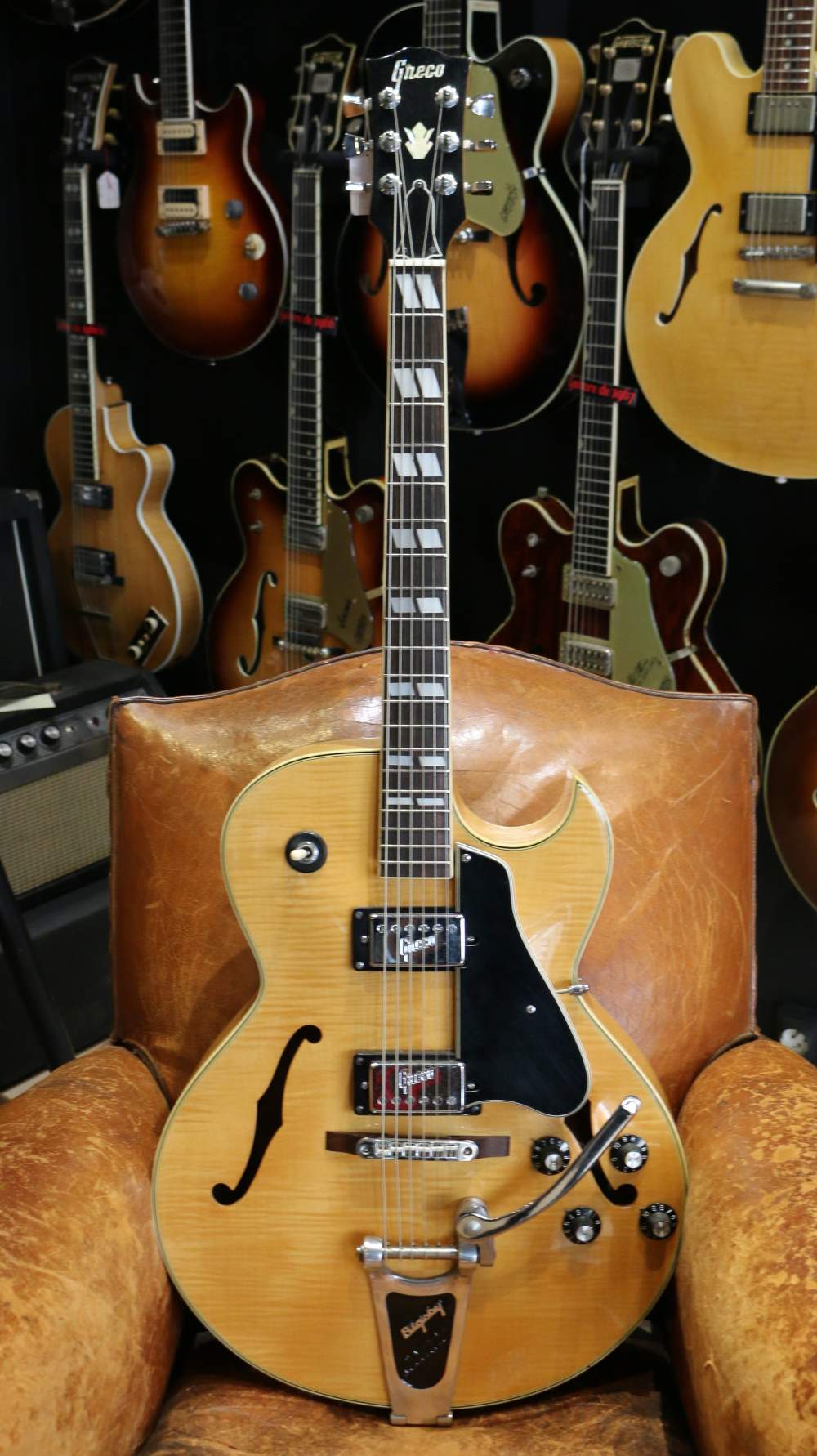 En toute logique de copie parfaite, Greco grava donc son nom sur les deux Humbucker présent sur cette ES-175. Cette Greco aux érables très figurés est également équipée d'un bigsby et propose de somptueuses sonorités typique d'une Gibson ES-175.