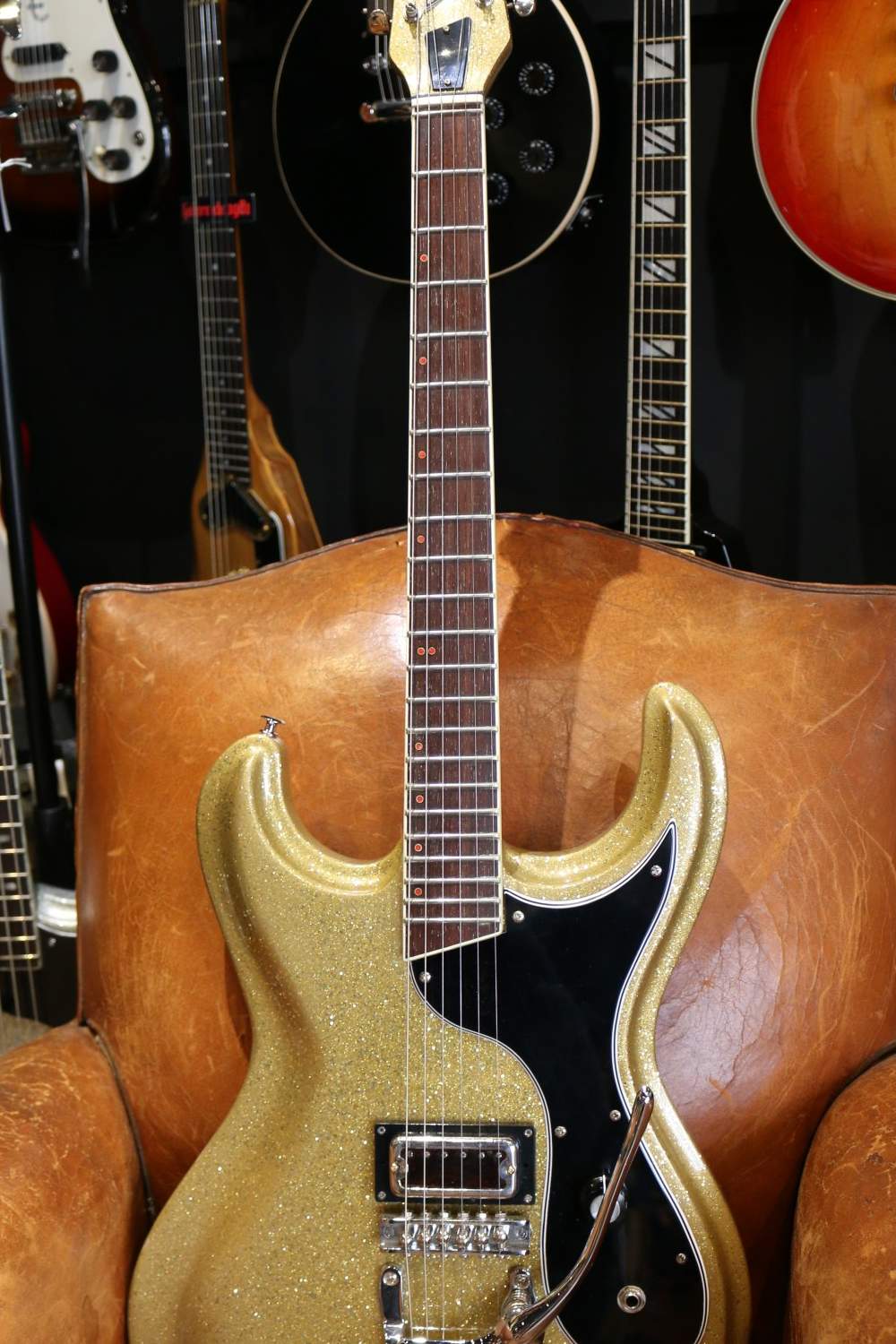 Conçue en coloris Gold Sparkle sur un format type Junior, avec un seul micro bobiné à la main par le luthier lui-même. La guitare est montée avec un vibrato type Bigsby et un contrôle unique de volume.