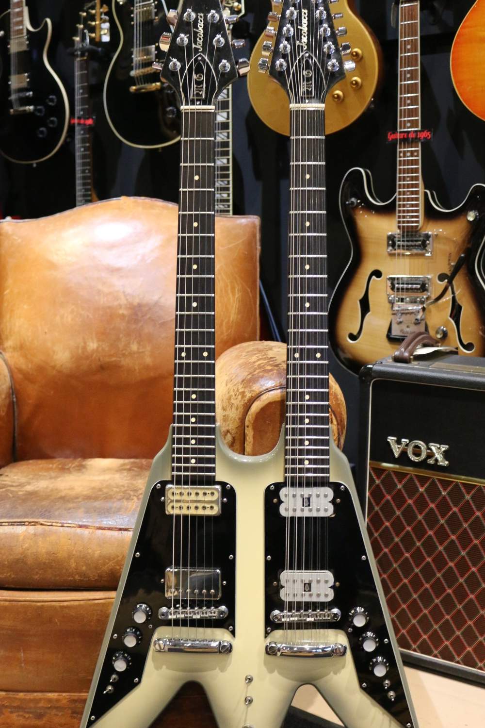 Guitare Collection présente un magnifique exemplaire unique : une Jacobacci double manche de forme Flying V (ou Flying W) de 1981 en finition Silverburst !