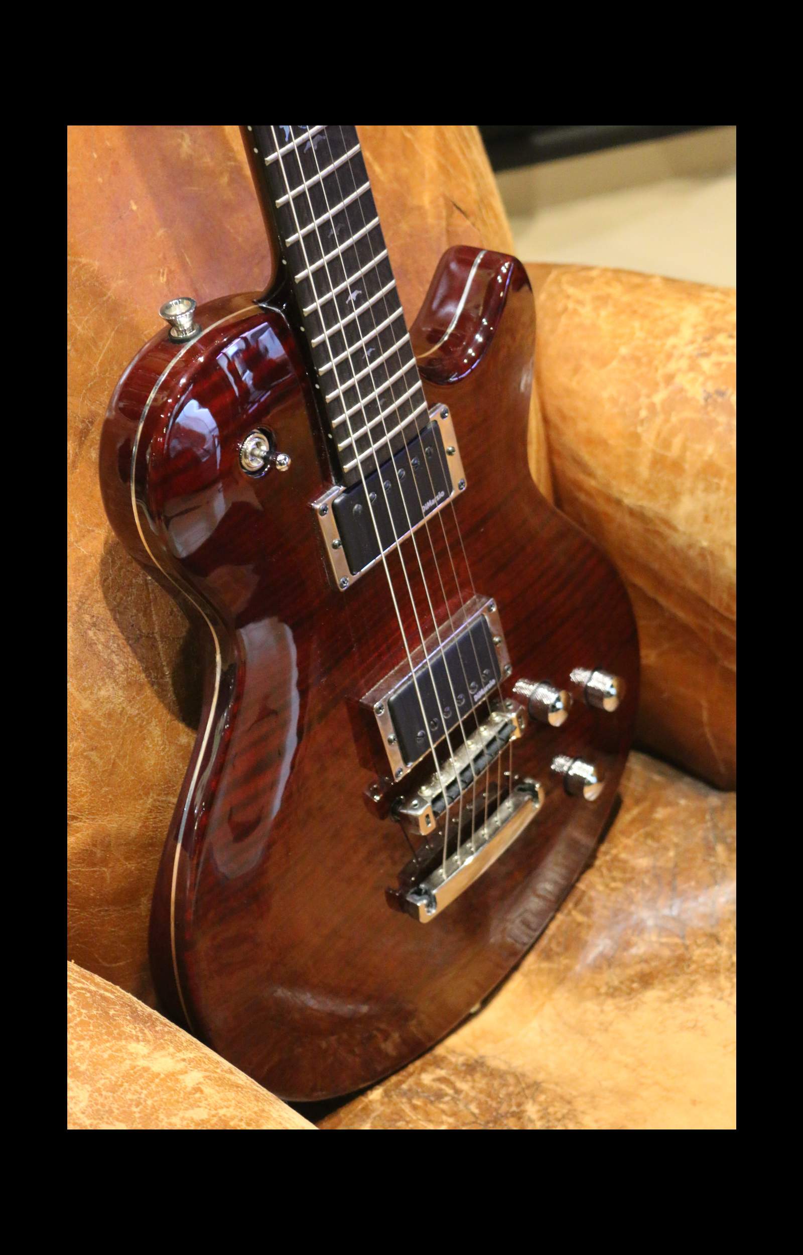 Inspirée des modèles single-cut type Les Paul, elle se distingue par une lutherie très soignée et des matériaux premium : corps en acajou africain avec table en érable figuré, manche collé en acajou renforcé et touche en ébène.