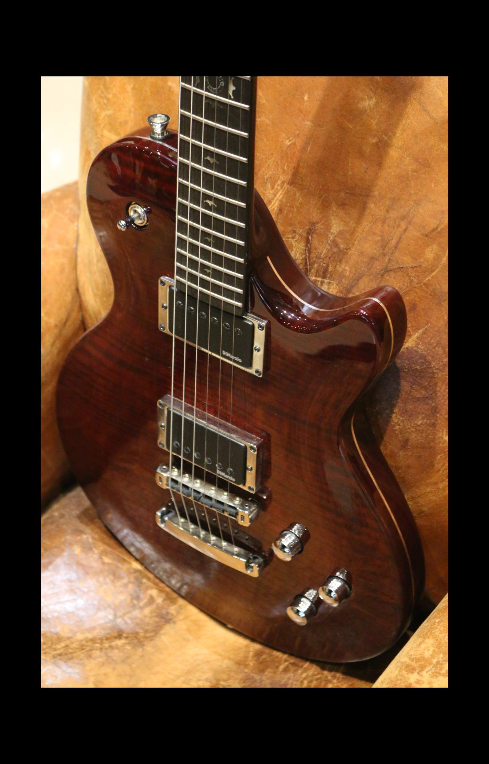 Inspired by single-cut models such as the Les Paul, it stands out for its meticulous craftsmanship and premium materials : an African mahogany body with a figured maple top, a set-in reinforced mahogany neck, and an ebony fingerboard.