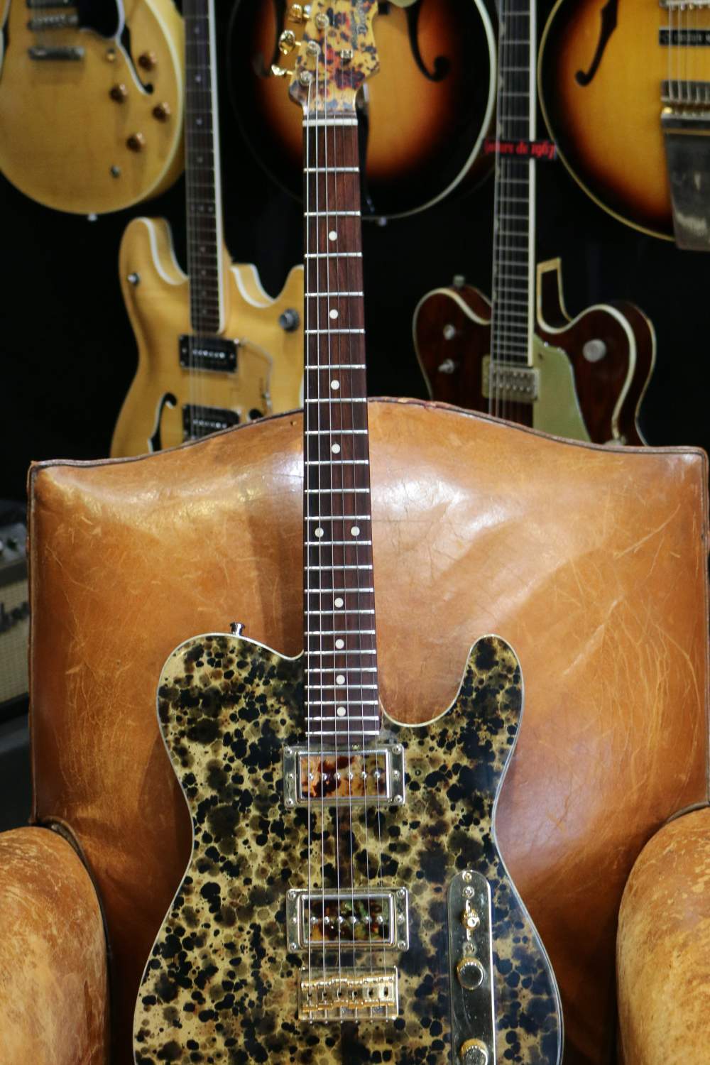 Une finition explosive qui fait penser à des jets d’encres ou à une peinture à l’aquarelle dans les tons noir et marron, qu’on retrouve souvent chez le luthier. Un double binding en perloid, des micros Rio Grande Bastards (Made In Texas) avec capots customisés, qui recréent à merveille le son des P90 des années 50, micros ayant appartenu au guitariste du groupe londonien Jim Jones Revue. Une belle touche en palissandre sur un manche en érable. Un accastillage doré qui se marie parfaitement à l’esthétique de l’instrument. En bref une guitare unique et singulière, signature du grand Philippe Dubreuille.