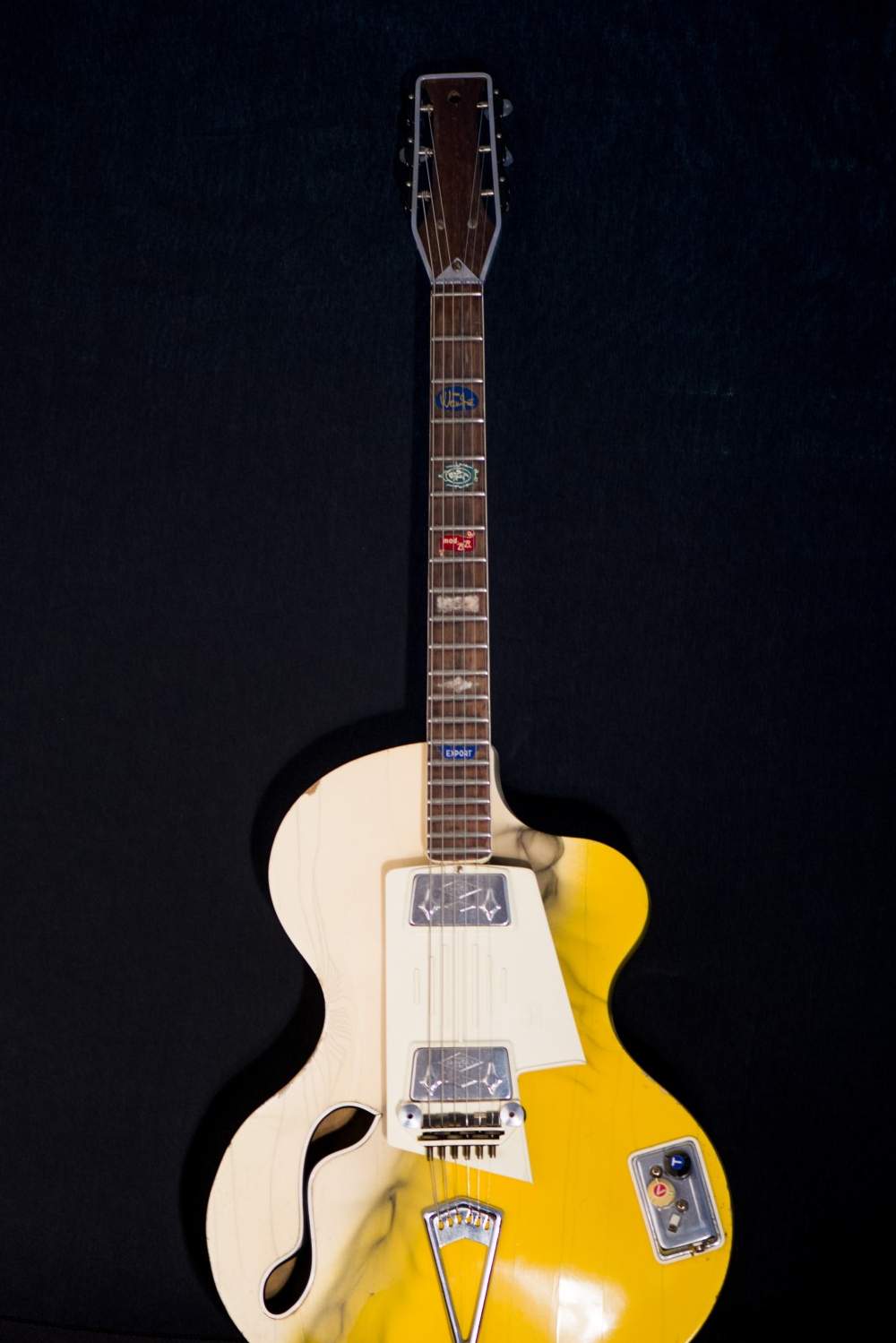 Wandre est une marque d’instruments Italienne, spécialisée dans les guitares et basses électriques. Wandre a été créé par Antonio Vandrè Pioli en 1957. L’usine ronde de Cavriago, Italie entre en service en février 1958. Dans cette usine seront fabriquées les guitares et basses Wandre jusqu’en 1968. Les Wandres sont reconnues pour leurs formes originales, leur manche en aluminium et leur électronique unique. La production de ces instruments était très réduite, ce qui fait des Wandres des instruments très recherchés dans le marché du Vintage. Guitare Collection vous propose cette très rare Wandre DAVOLI BB des années 60. Yellow smoked Exclusivement chez Guitare Collection, Paris !