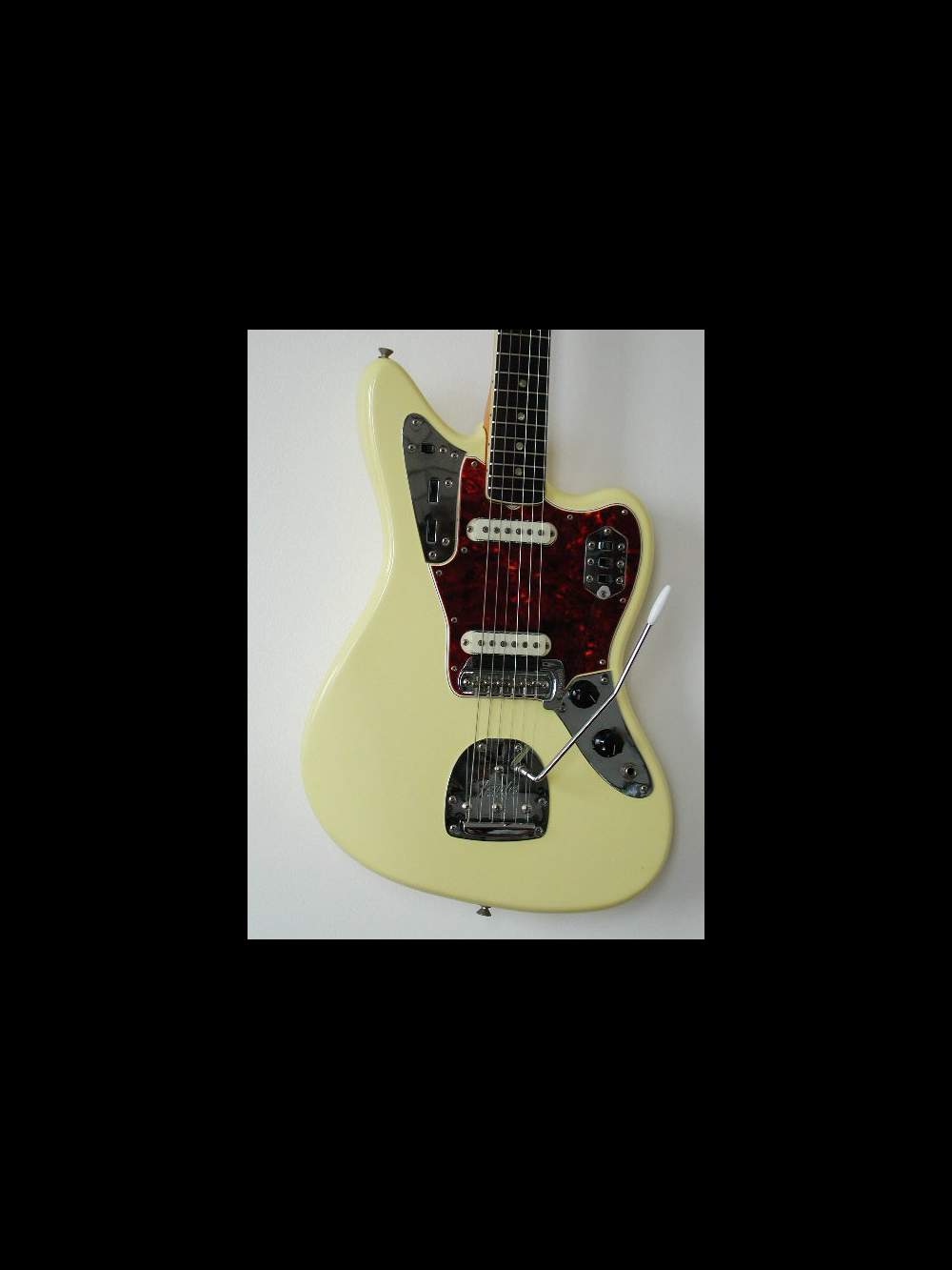 Pour le plaisir, une Jaguar fabriquée par Fender en 1965 (pré CBS). Très rare couleur white originale. Les Fender Jaguar ont été produites de 1962 à 1975. Une version de la Jaguar 1962 à été produite au japon de 1995 à 1999 et depuis 1999, elle est fabriquée de nouveau aux USA. Ecoute la bande son.