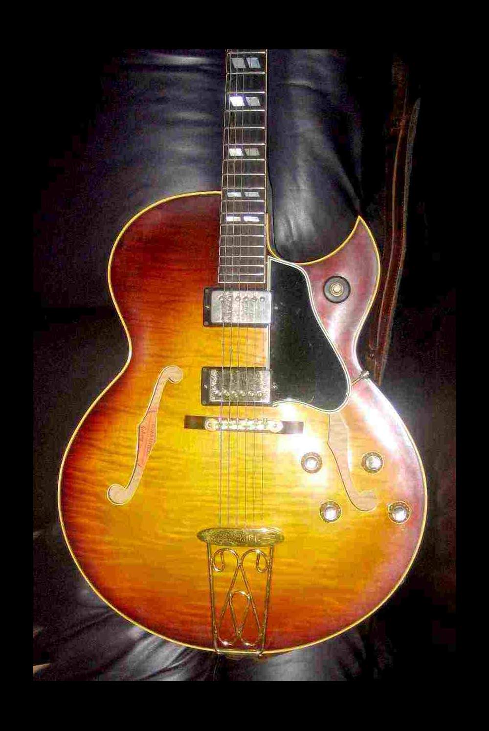 Gibson ES 350TD de 1962. Elle est en parfait état d'origine. La fabrication de la Gibson ES 350 débute en 1947 avec une vesrsion full body archtop, single cutaway et 1 micro P90 jusqu'en 1948. Apparait ensuite la version avec 2 micros P90 jusqu'en 1956. Vient ensuite La Gibson ES 350T (thinline) qui a été produite de 1955 jusqu'en 1963 avec un cutaway arrondi pendant les années 1955-1960 et un cutaway pointu de 1961-1963. Les micros sont des P90 entre 1955-1956 puis des humbuckers après. Une version Reissue (Second Issue Norlin) est apparue entre 1977 et 1981. Guitare d'une qualité de son exceptionnelle.