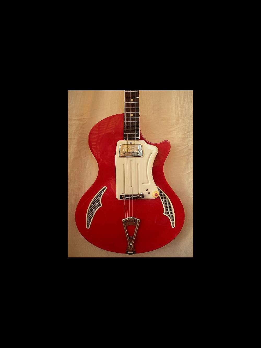 Wandré Pioli, créateur de ces guitares dans les années 1960, a probablement inspiré les courbes de ce modèle. La forme de la Wandré Tri-Lam, comme toutes les Wandré est une interprétation réussie de recherche d'avant-garde. Wandré a produit des guitares de 1957 à 1969. La production, toujours avant gardiste était composée de solidbody, hollowbody guitares et basses. Wandré a produit sous les marques Wandré, Davoli, Framez, Noble, Dallas, Avalon, Avanti et autres. La production a été réalisée essentiellement à Milan en Italie. Guitares aux lignes superbes, le son était aussi très présent avec les micros Davoli et Framez. Cette Wandré Tri-Lam rouge, manche en aluminium, avec son pickguard crème n'a pas le double binding autour du body qu'on trouve sur le modele export. C'est certainement un des premier exemplaire produit fin des années 1950. Elle a son mini jack d'origine, et nous devons un très grand merci à notre ami Serge de Metz qui l'a bichonnée depuis toujours. Cette guitare n'a eu qu'un seul et unique propriétaire. Elle sonne particulièrement bien. Ecoute la bande son.