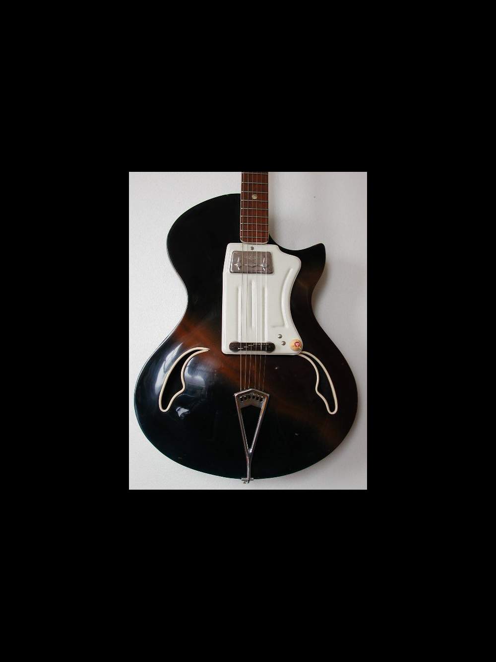 Cette Wandre Trilam décorée d'une peinture psychedelic avec deux petites ouies et un pointed cutaway est une nouvelle version de l'art de Wandré pour la conception et le designe très furutiste de ses guitares. Couleurs mélangées et oppositions de formes et de matières, une signature constante de Monsieur Wandré. Le son n'est pas en reste, et cette guitare est très Rock' n Roll des années 60.