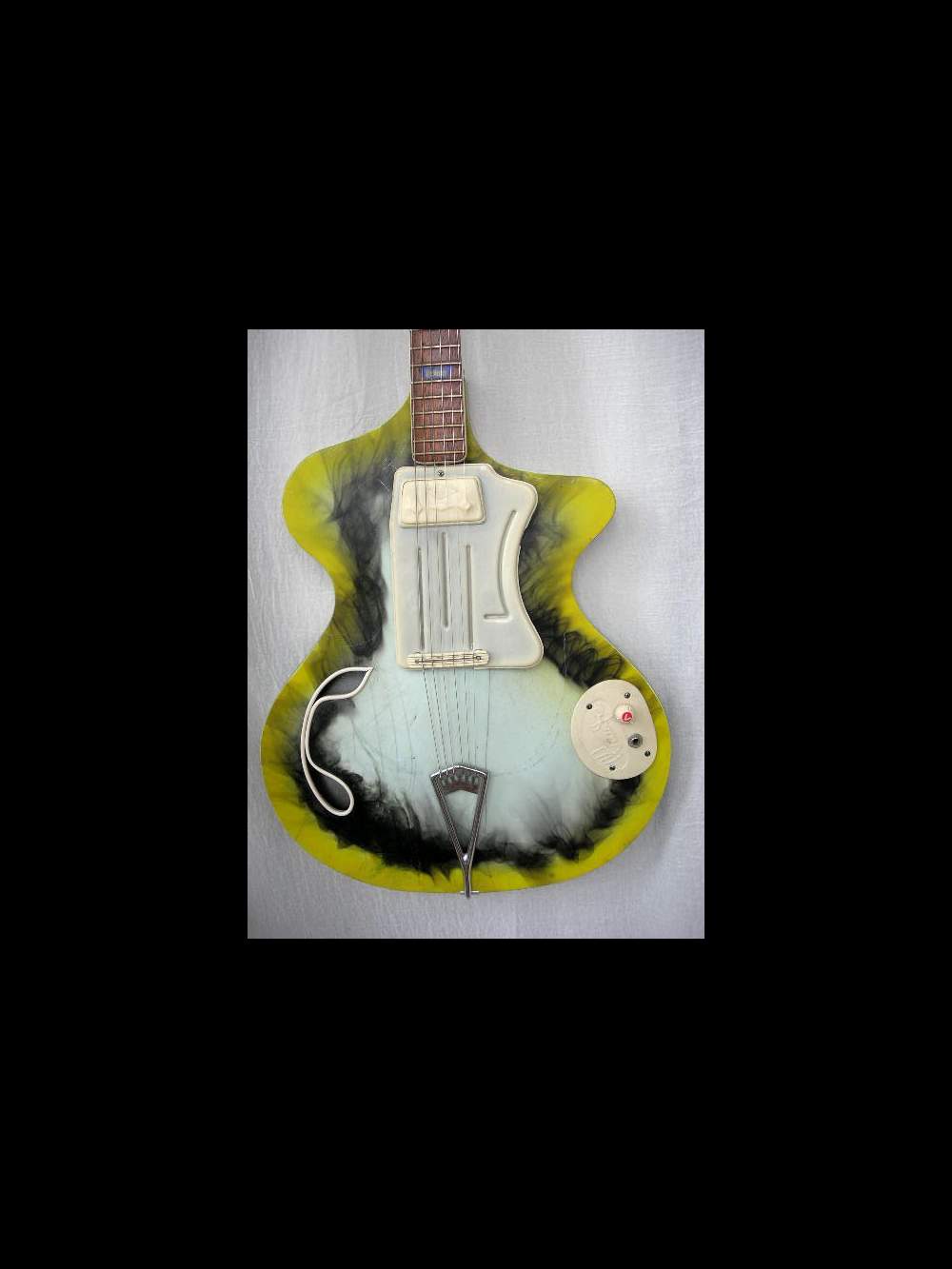 Superbe Wandré Waid qui date de la fin des années 1950. Encore une guitare signée Wandré qui est une oeuvre d'art en plus d'etre un instrument de musique. Cette guitare a échapée de peu à une transformation en violon, en effet, on voit encore les traces de marquage sur le body de la forme violon qui devait etre découpée avec le corps. heureusement que j'ai trouvé cette guitare avant que le luthier soit passé à l'acte. Ecoute la bande son.