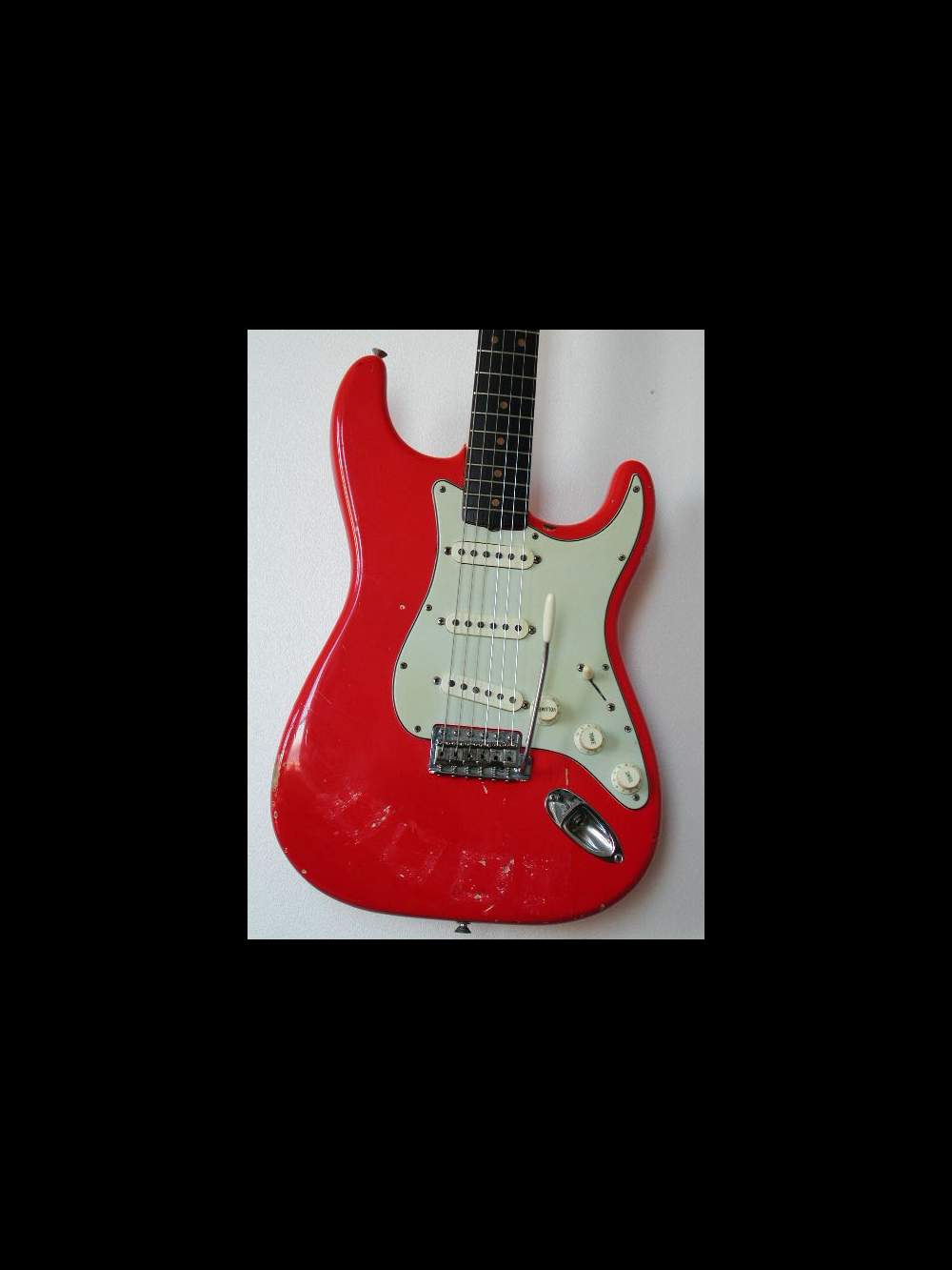 Cette guitare Fender Stratocaster fiesta red de 1963 est entièrement d'origine sauf la plaque arrière. Guitare exceptionnelle, ecoute la bande son.