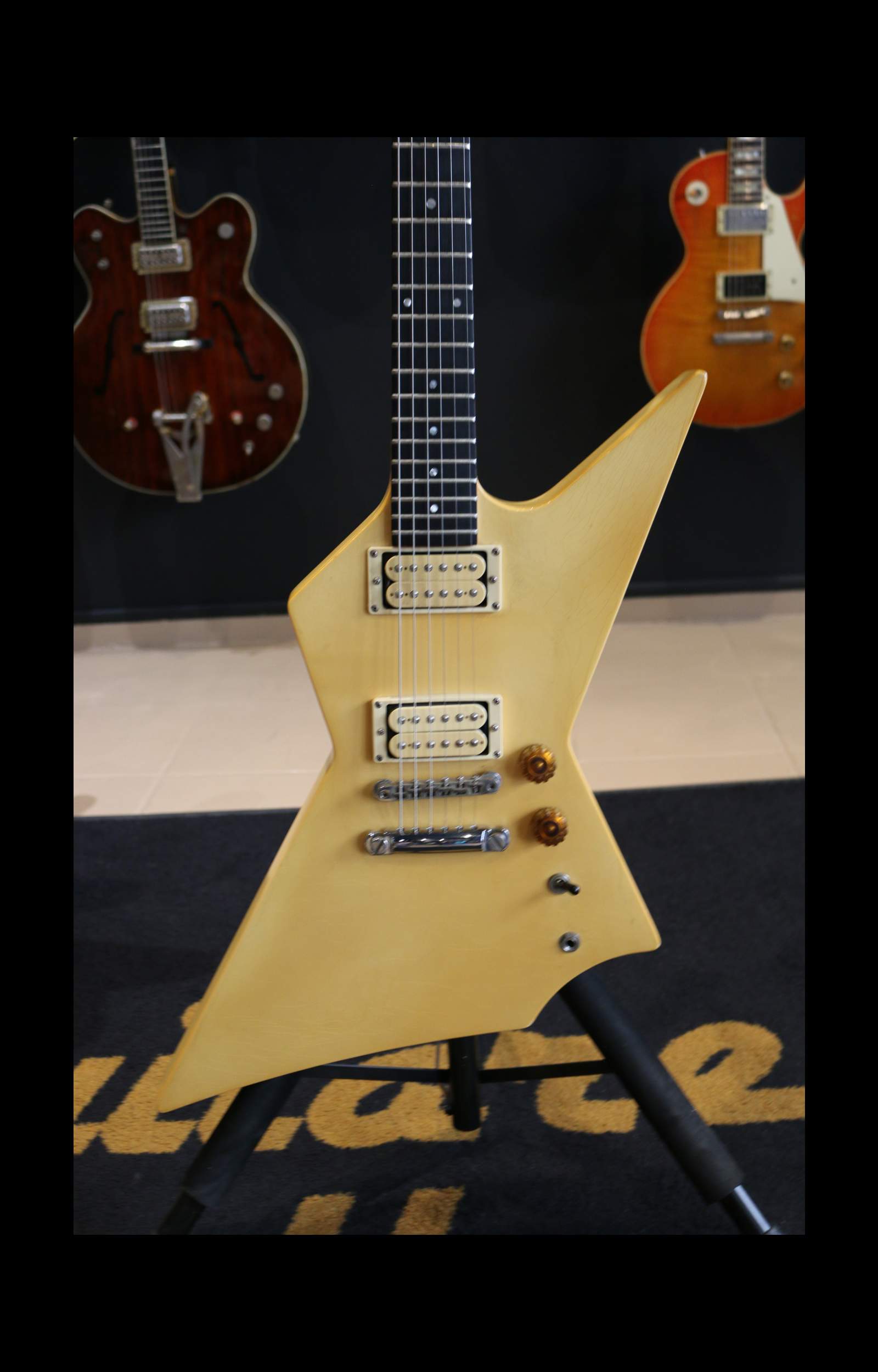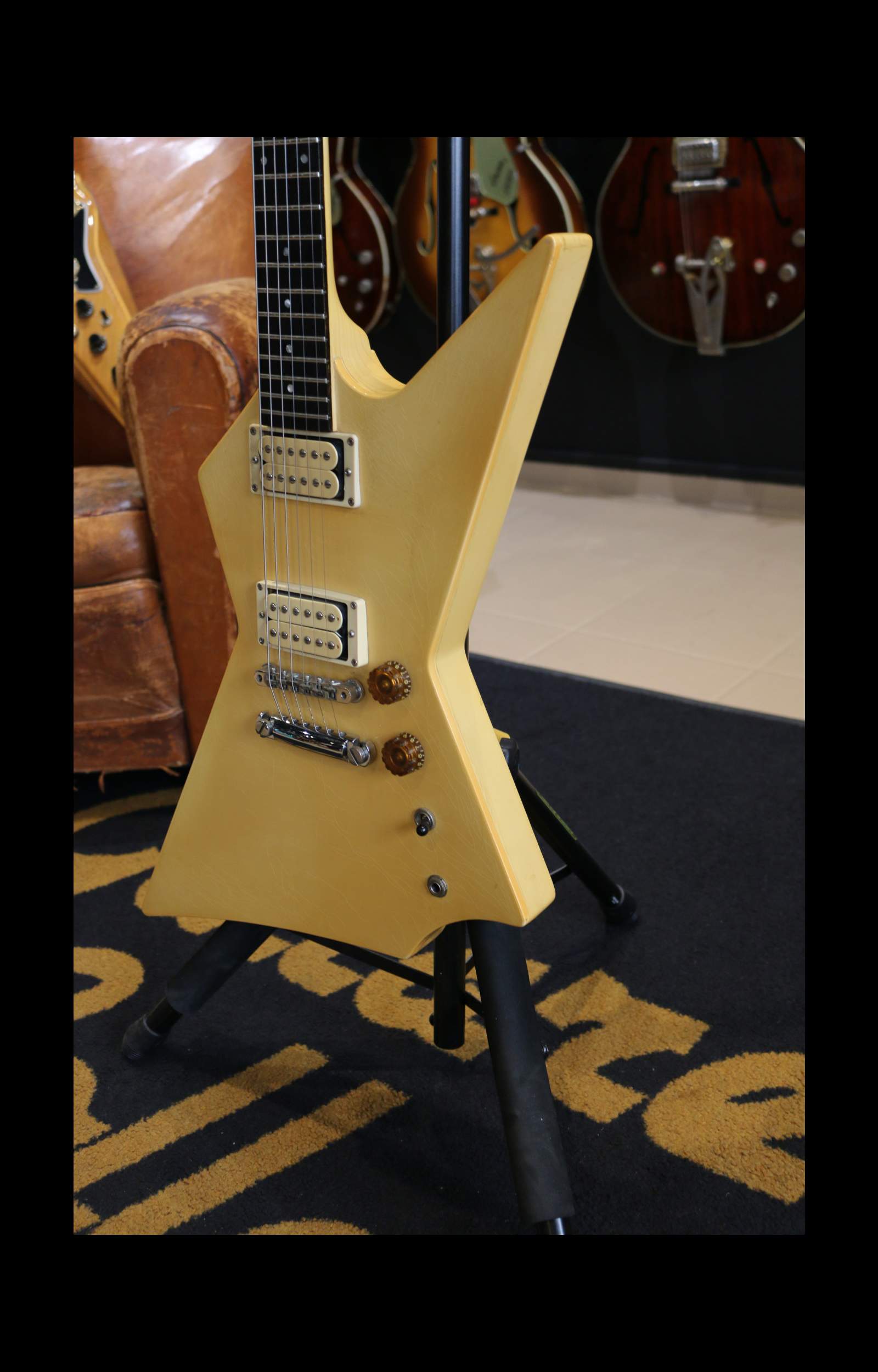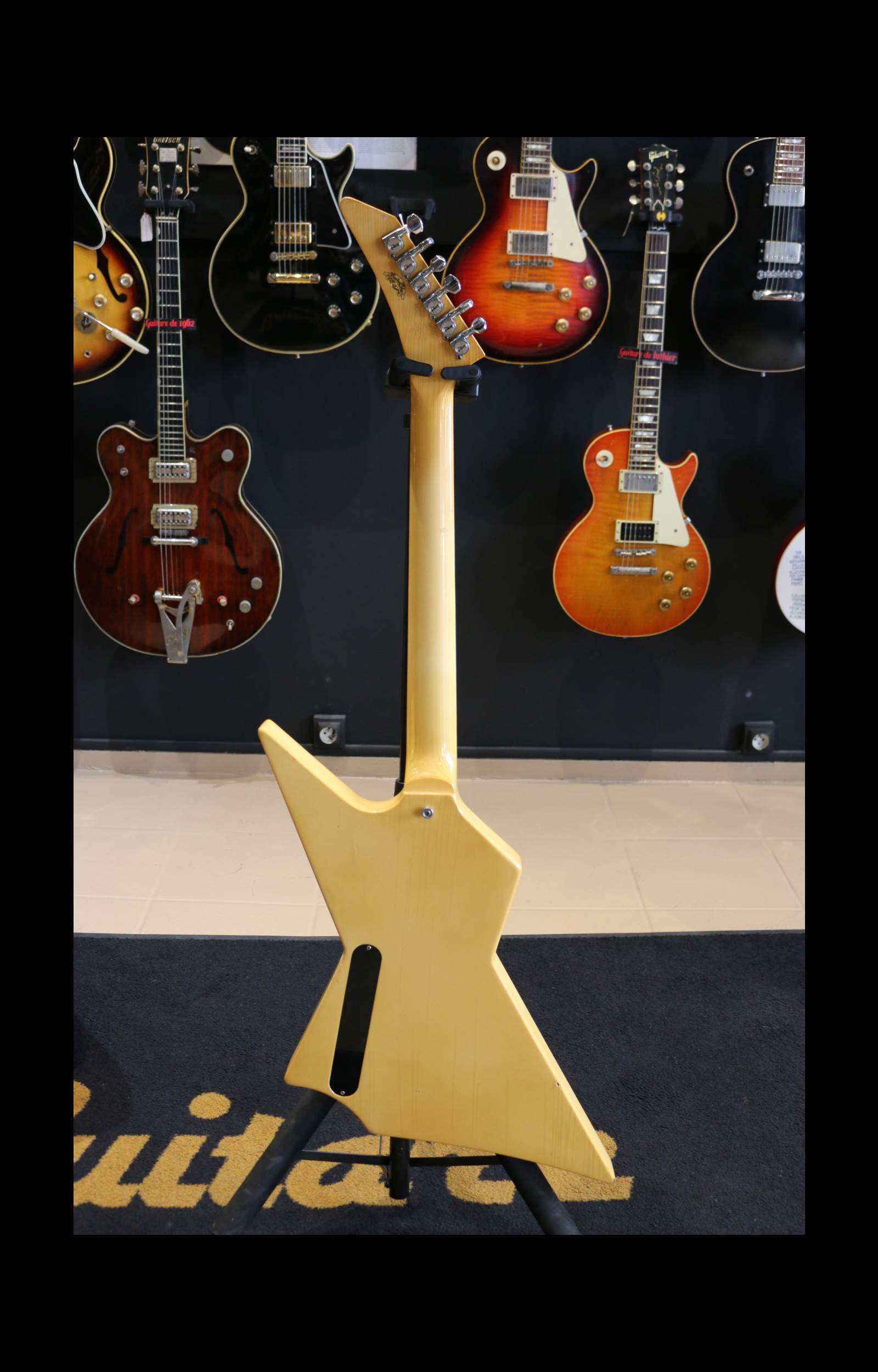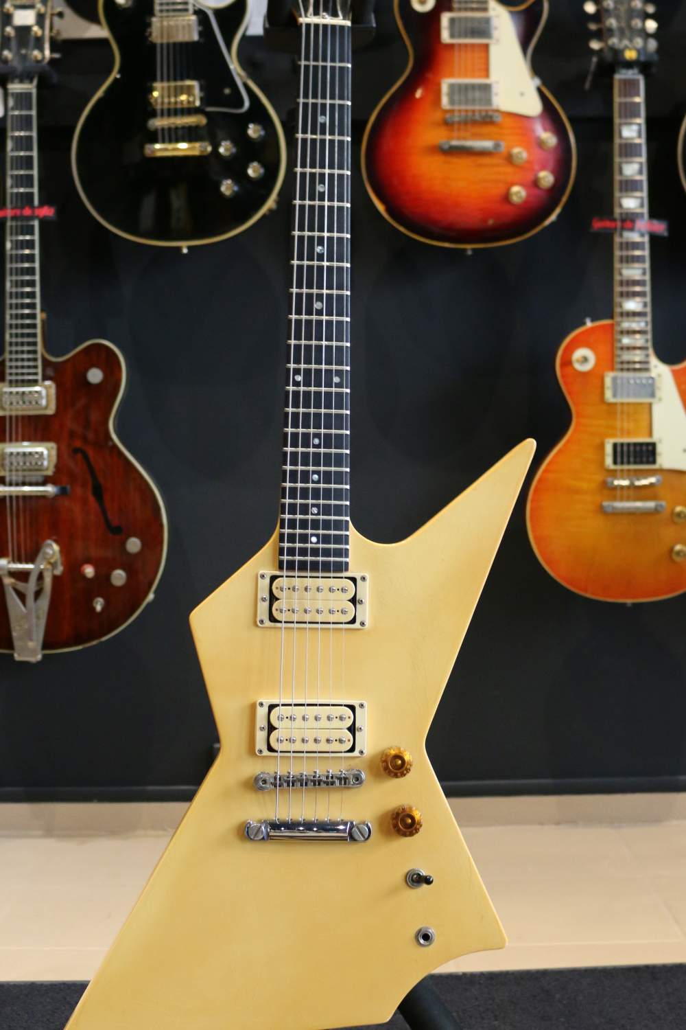 Nous avons ici un instrument fabriqué à Nashville en 1985 : un corps d’Explorer légèrement revisité avec une belle finition ivoire qui a jauni avec les années. La tête est un peu plus angulaire avec un beau faïençage.