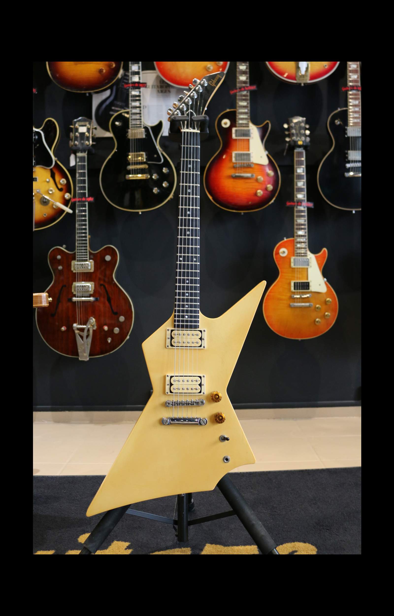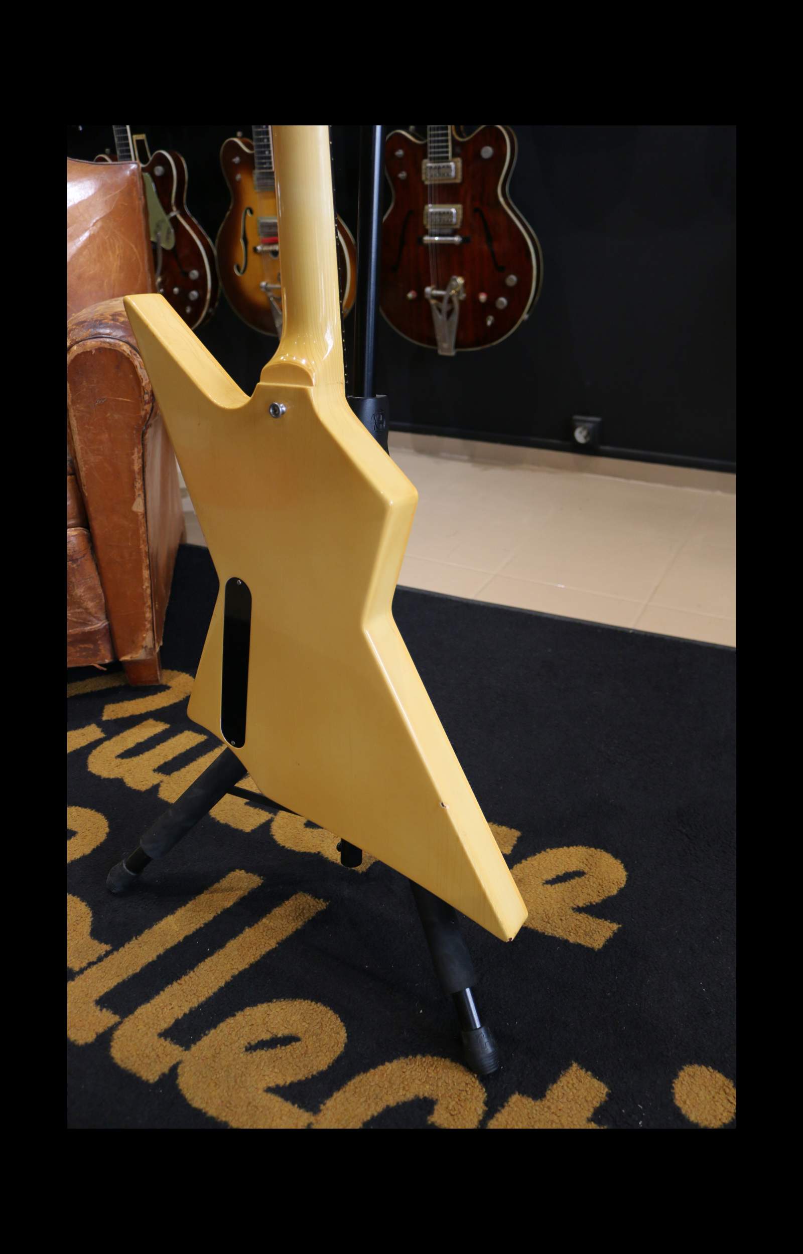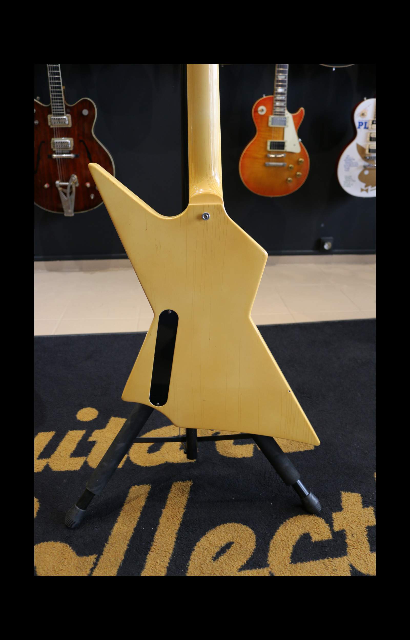 Nous avons ici un instrument fabriqué à Nashville en 1985 : un corps d’Explorer légèrement revisité avec une belle finition ivoire qui a jauni avec les années. La tête est un peu plus angulaire avec un beau faïençage.