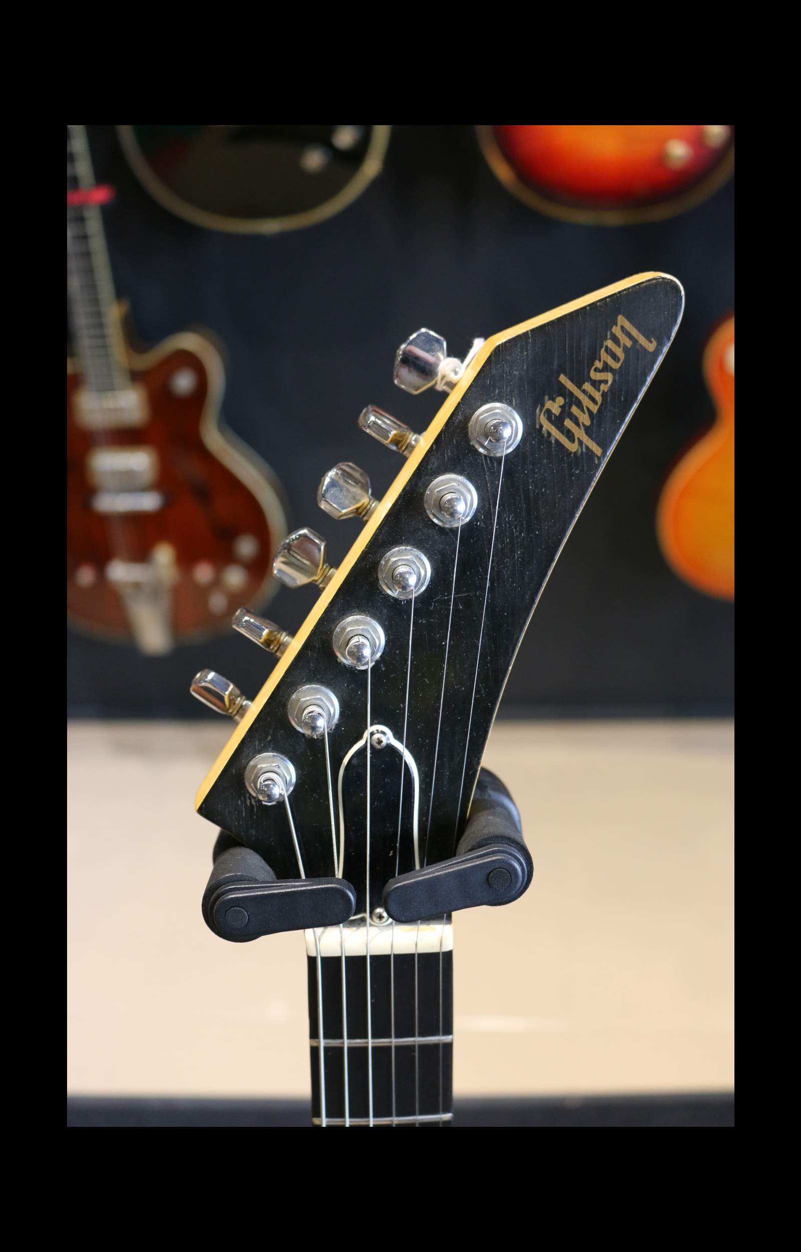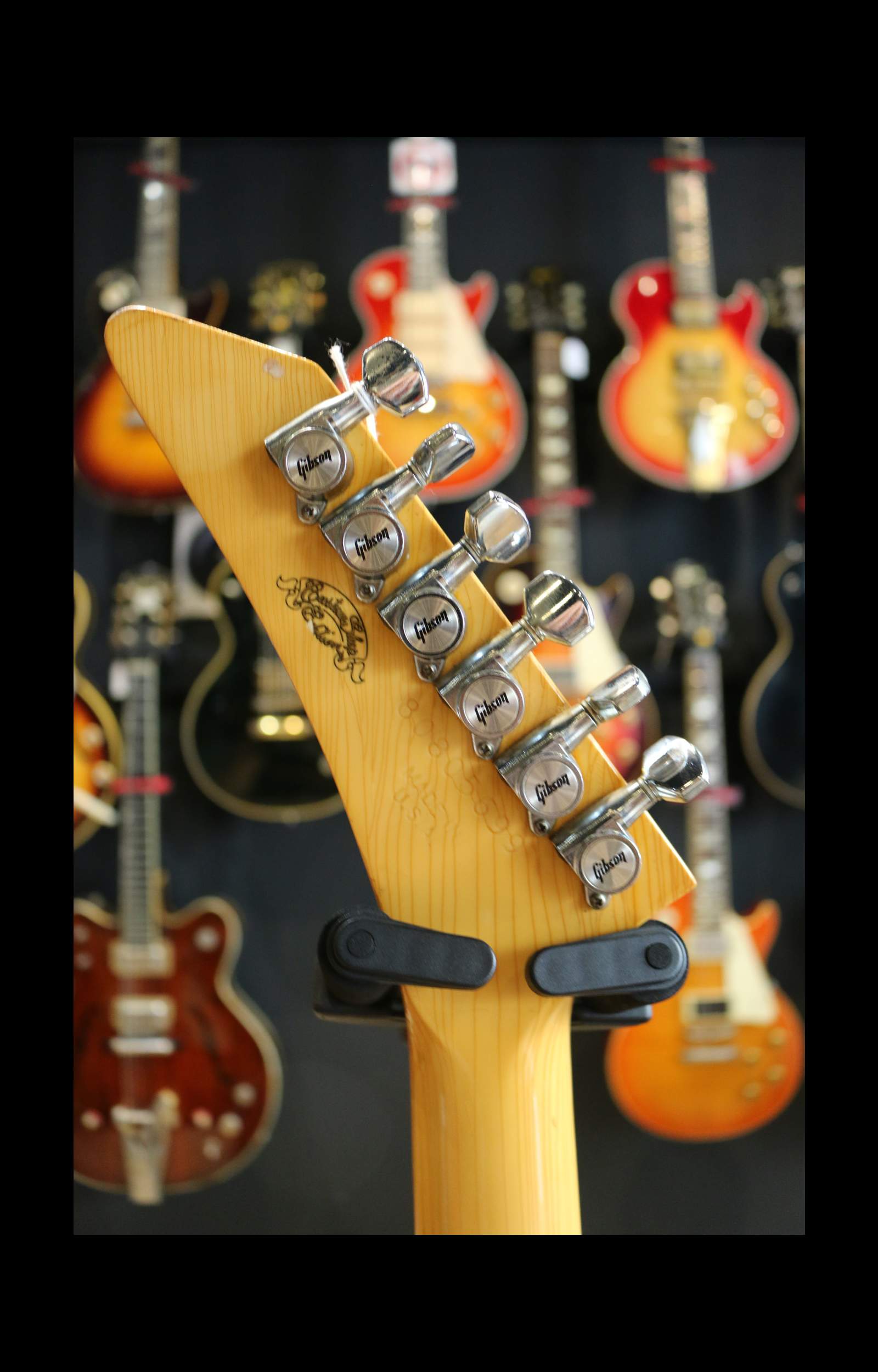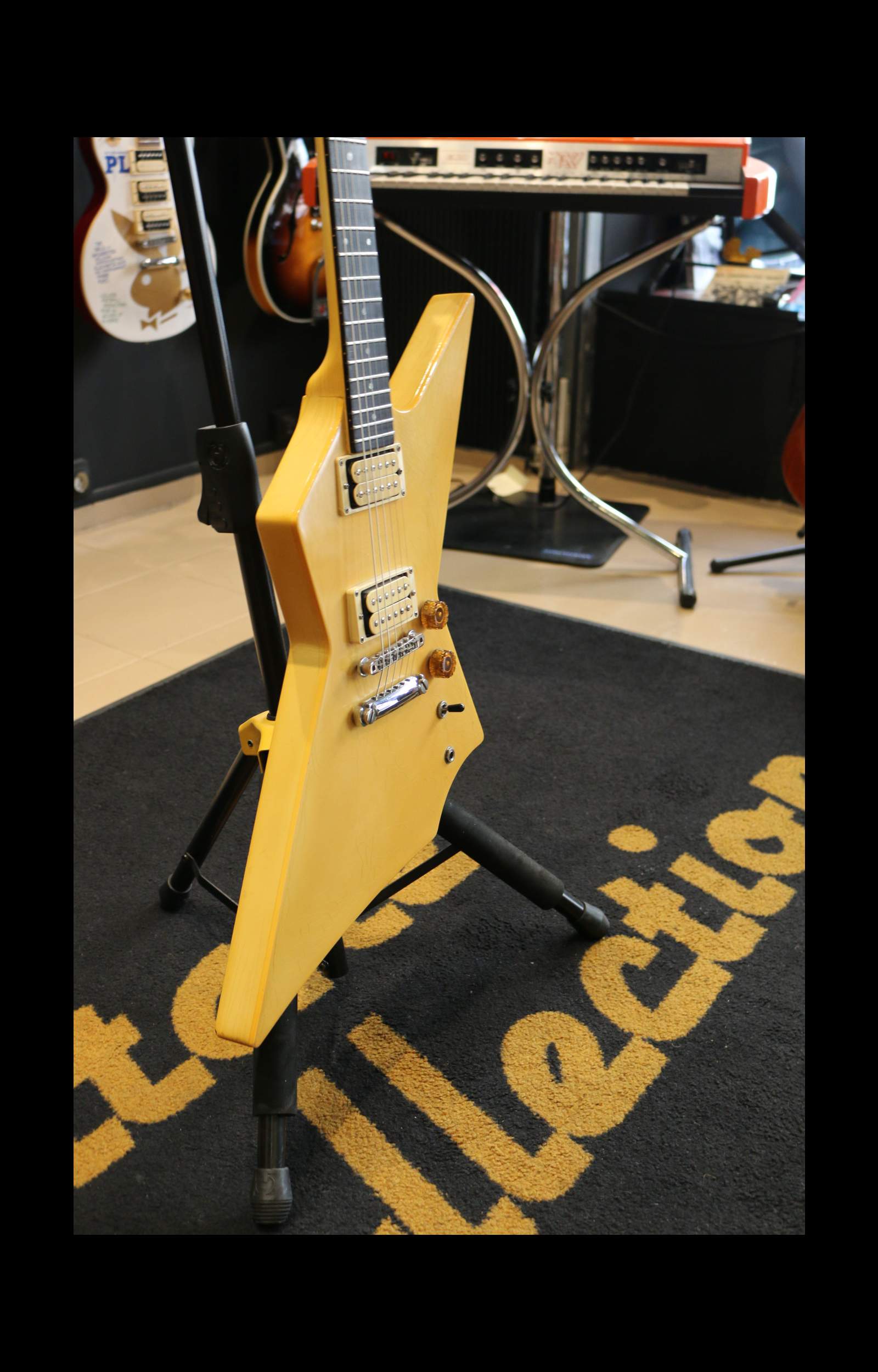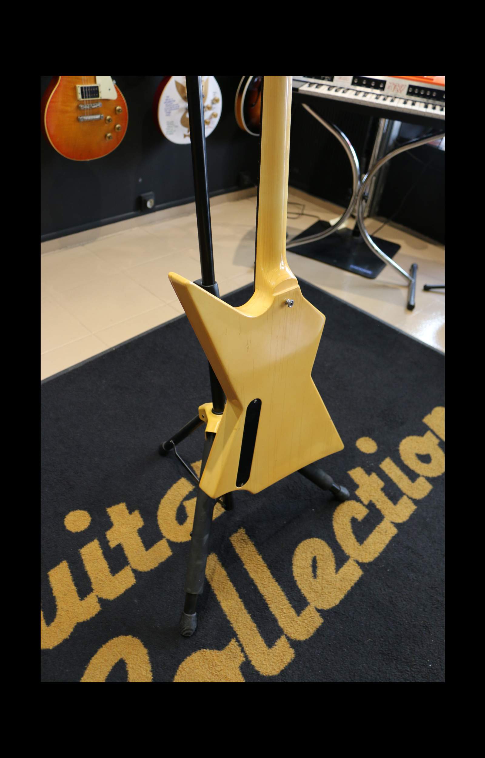Nous avons ici un instrument fabriqué à Nashville en 1985 : un corps d’Explorer légèrement revisité avec une belle finition ivoire qui a jauni avec les années. La tête est un peu plus angulaire avec un beau faïençage.