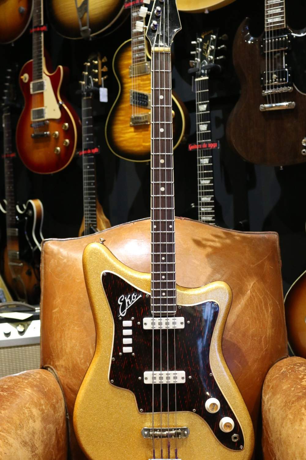 Guitare Collection vous propose cette très belle et rare Eko Bass 500 de 1964 en finition Gold habillée d'un beau pickguard Tortoise !