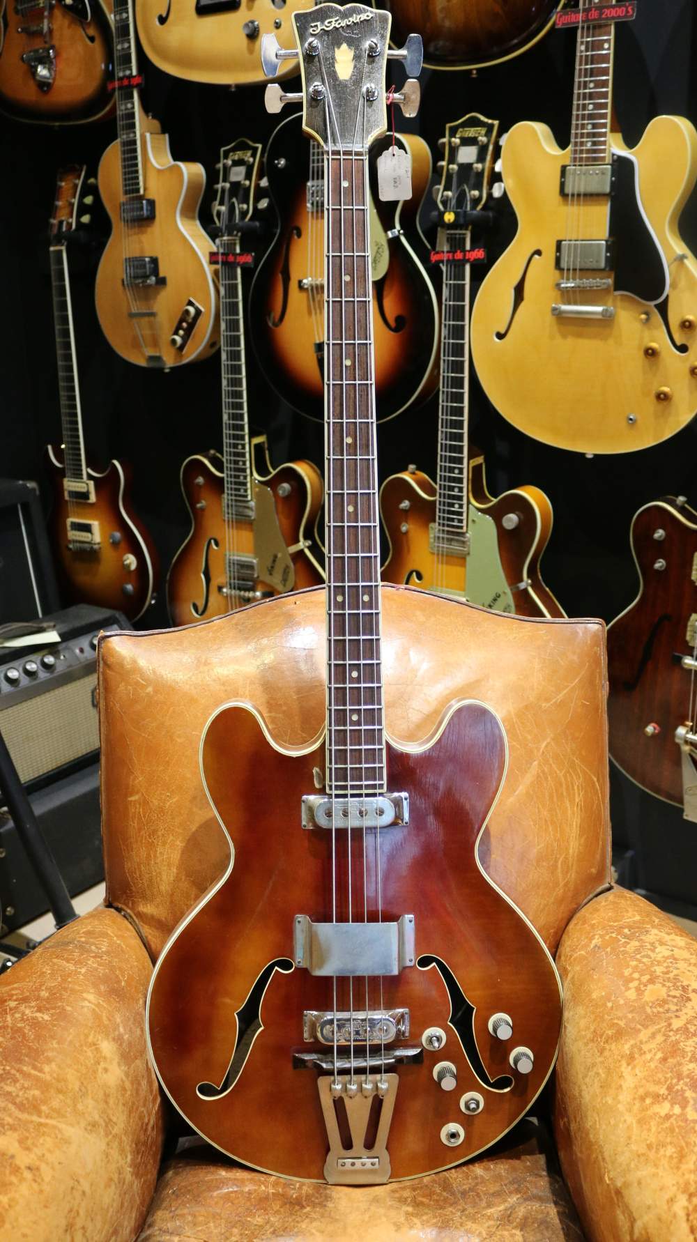 Fabriquée par l'atelier Favino au milieu des années 60, cette basse est une bonne alternative à l'iconique EB-2 de chez Gibson. Elle est équipée de micros RV Tonemaster (Radio Video Stevens) qui lui donnent des sonorités chaudes et profondes. En plus d'être légère, elle est confortable à jouer et à un super look avec sa couleur caramel.