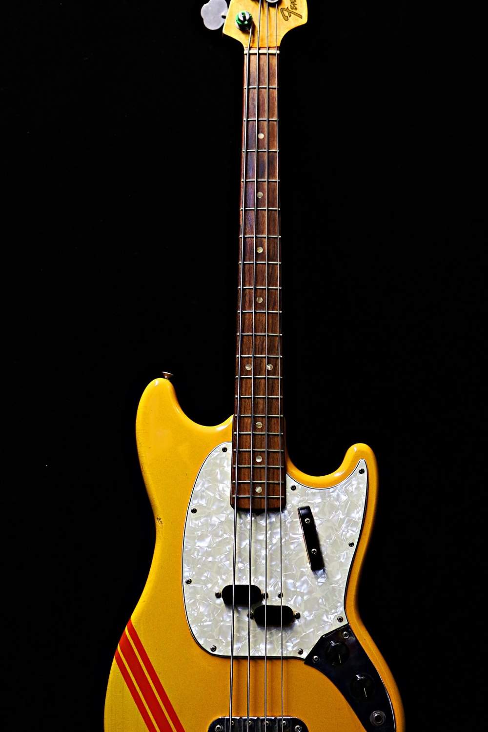 Guitare Collection vous propose cette somptueuse Fender Mustang Bass de 1972 en finition Yellow Competition (Jaune et bandes rouges).