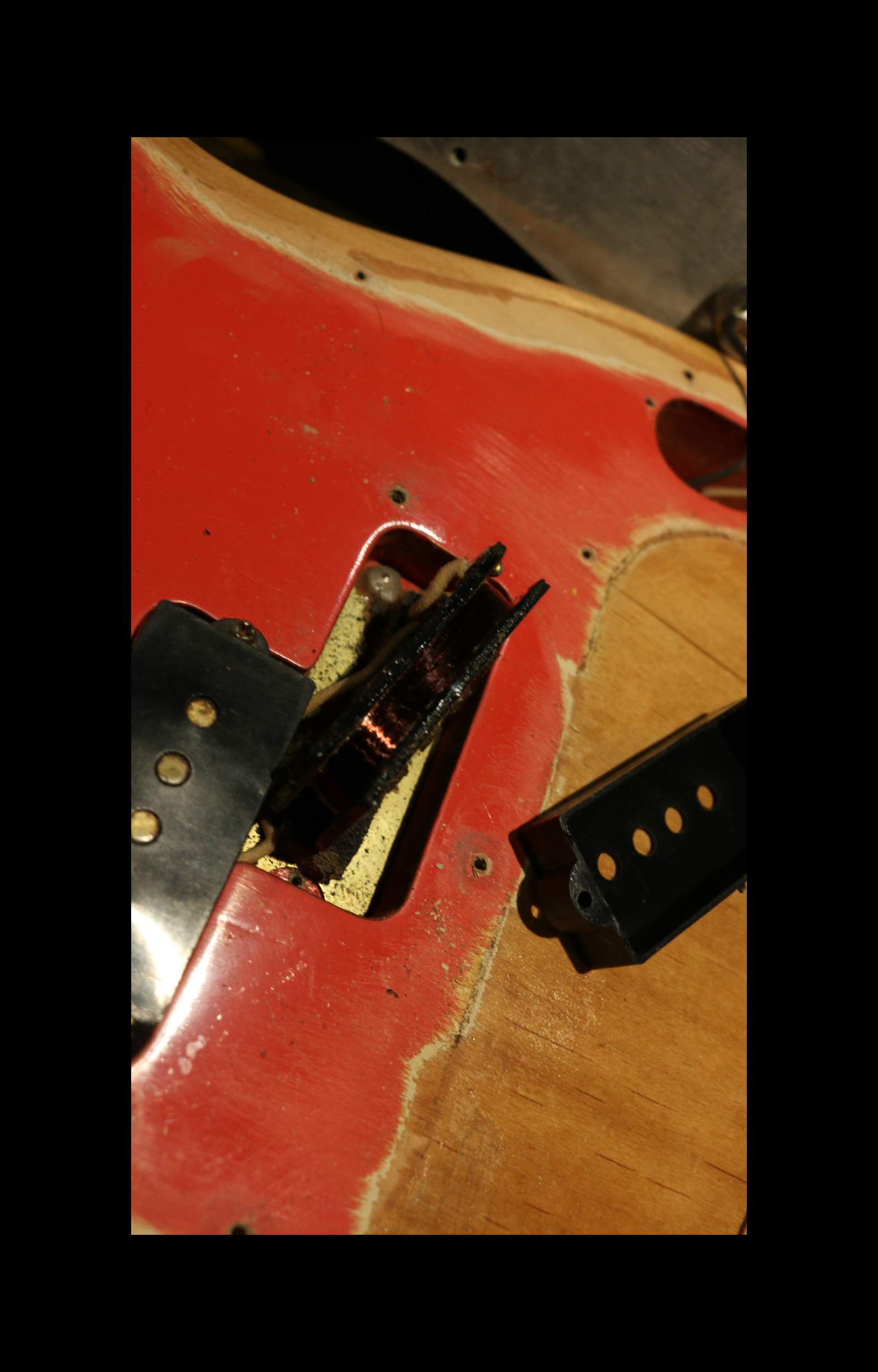 Pour suivre la mode des années 70, son propriétaire l'a décapé mais on retrouve sa couleur originale, le fiesta red, sous le pickguard tortoise.