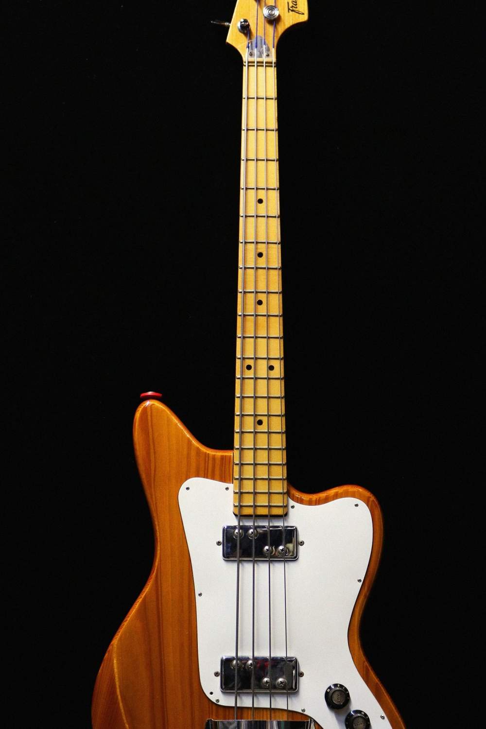 Une basse "Offset" très légère dans un superbe état avec un manche avec une touche en érable, deux micros, un bouton de volume par micro et un bouton de tonalité générale.
