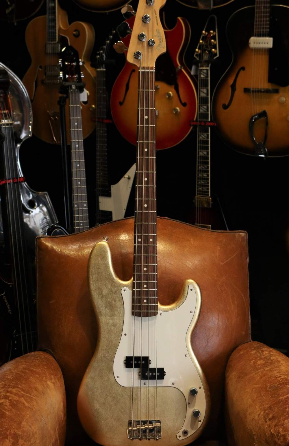 Guitare Collection vous propose cette somptueuse Gold Leaf Ltd Precision, qui comme son nom l’indique possède un corps de Precision doré à la feuille d'or et verni.