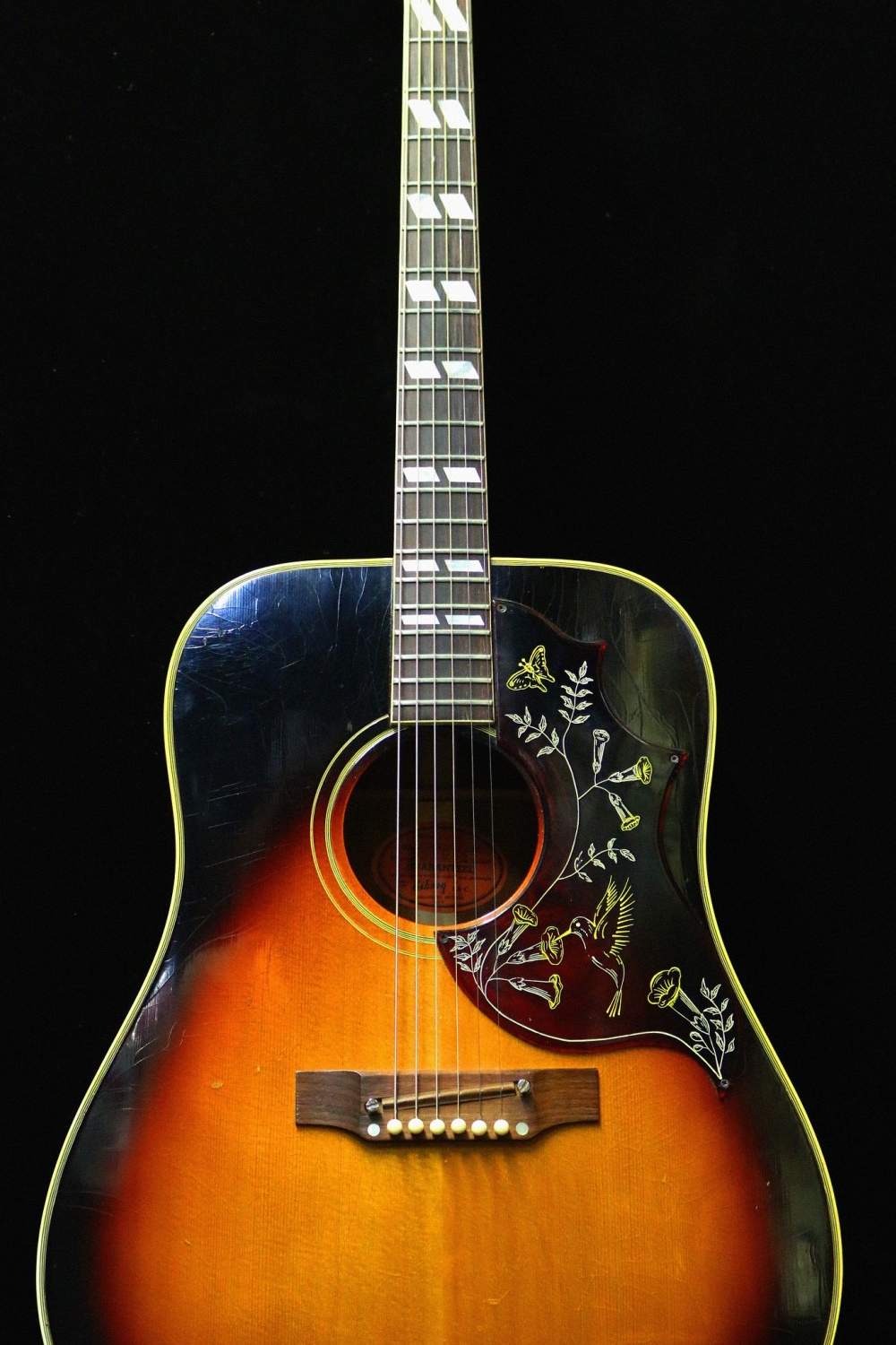 Le « pickguard » (plaque de protection) en était décoré de motifs de trompette de Virginie, d’un papillon et d’un « Hummingbird » (Colibri), origine du nom de cette Gibson.