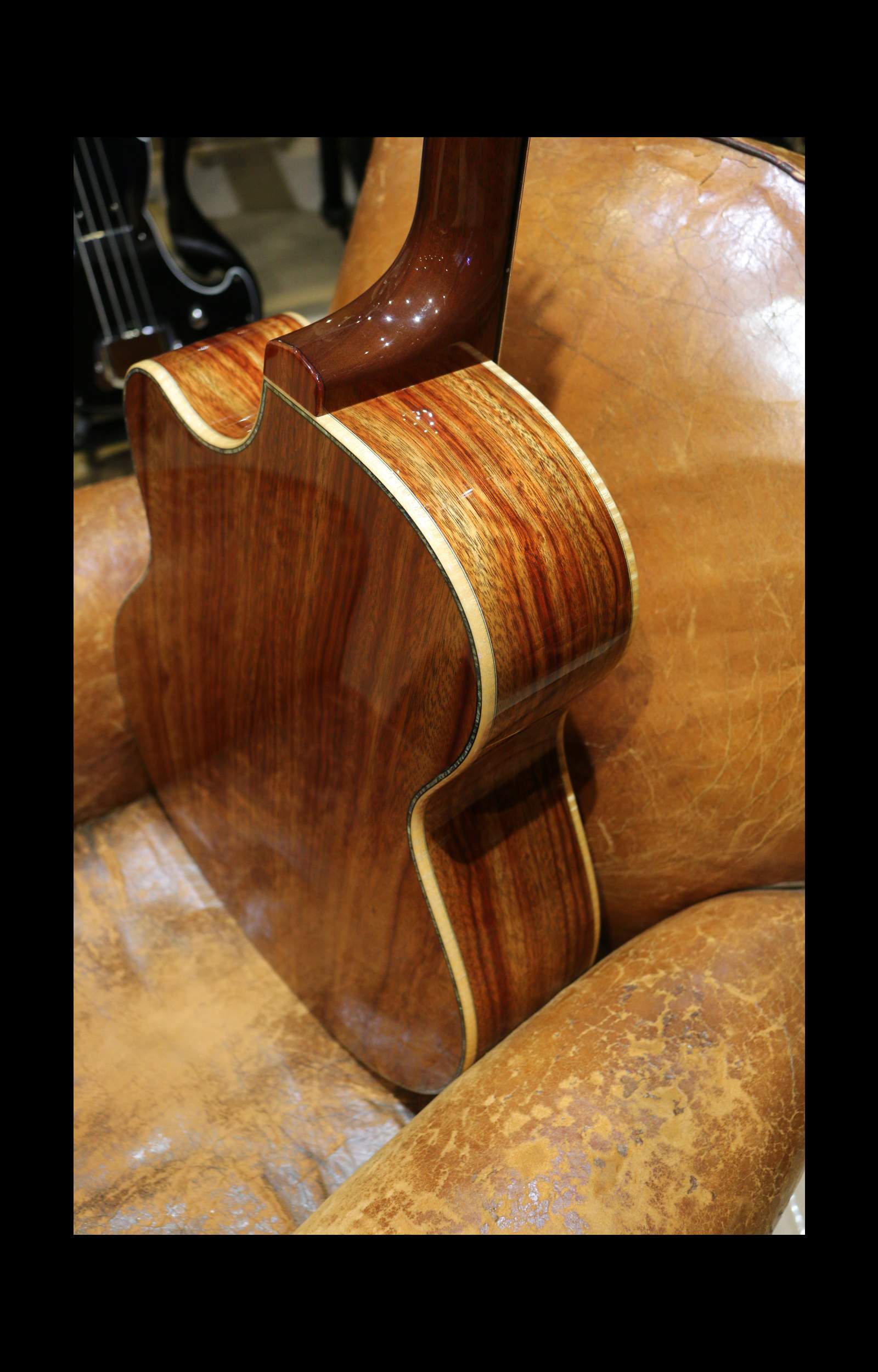 Back/Side : Bloodwood with curly maple binding, paua purfling on the back as well as black, maple and black purfling along the sides.