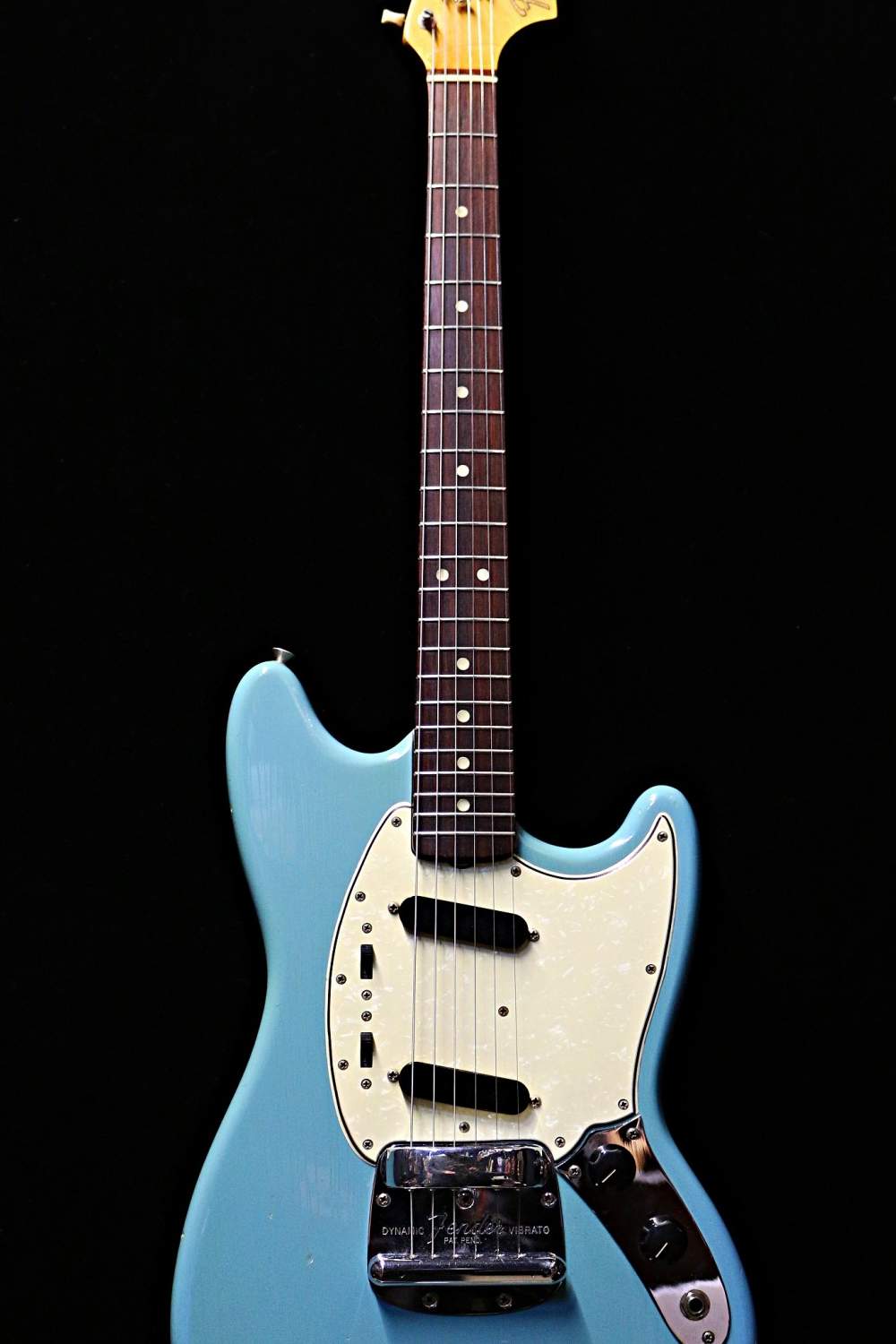 Guitare Collection vous propose cette somptueuse et rare Fender Mustang en finition Custom Color Daphne Blue de 1966, 100% originale, livrée avec son hardcase original.