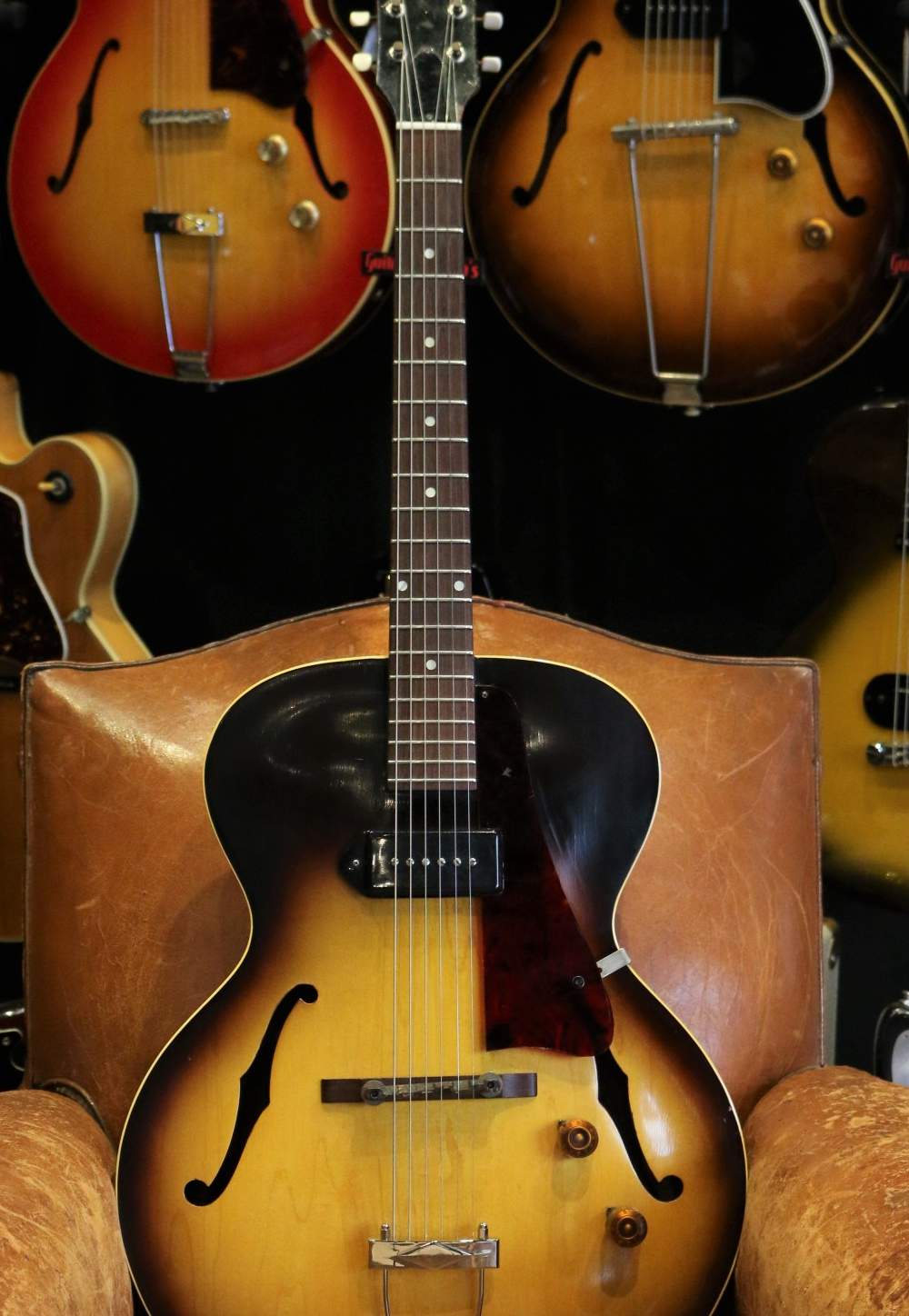 Une version fine de la ES-125 donc, sans pan coupé, dans un Sunburst d'une grande profondeur et un craquelage naturel du verni de toute beauté.