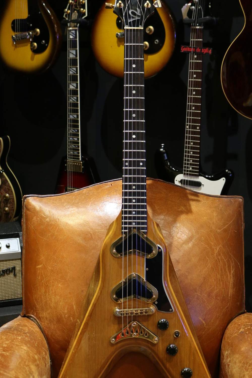 Guitare Collection vous propose ce modèle de 1981. Parmi les V2 sur le marché, celle ci est encore plus rare car à l'origine, corps et manche sont un assemblage judicieux d'érable et de noyer. Or, si celle-ci a le manche fabriqué dans ces deux matériaux et en cinq parties (ce qui garantit une rigidité sans égale, avec un trussrod efficace comme au premier jour), le corps est en érable et Korina, bois qui fait évidemment grimper la cote de l'objet. A part quelques rayures sur l'arrière, l'état de cette guitare est proche du neuf. Non seulement le look scénique est garanti, mais le son est redoutable.