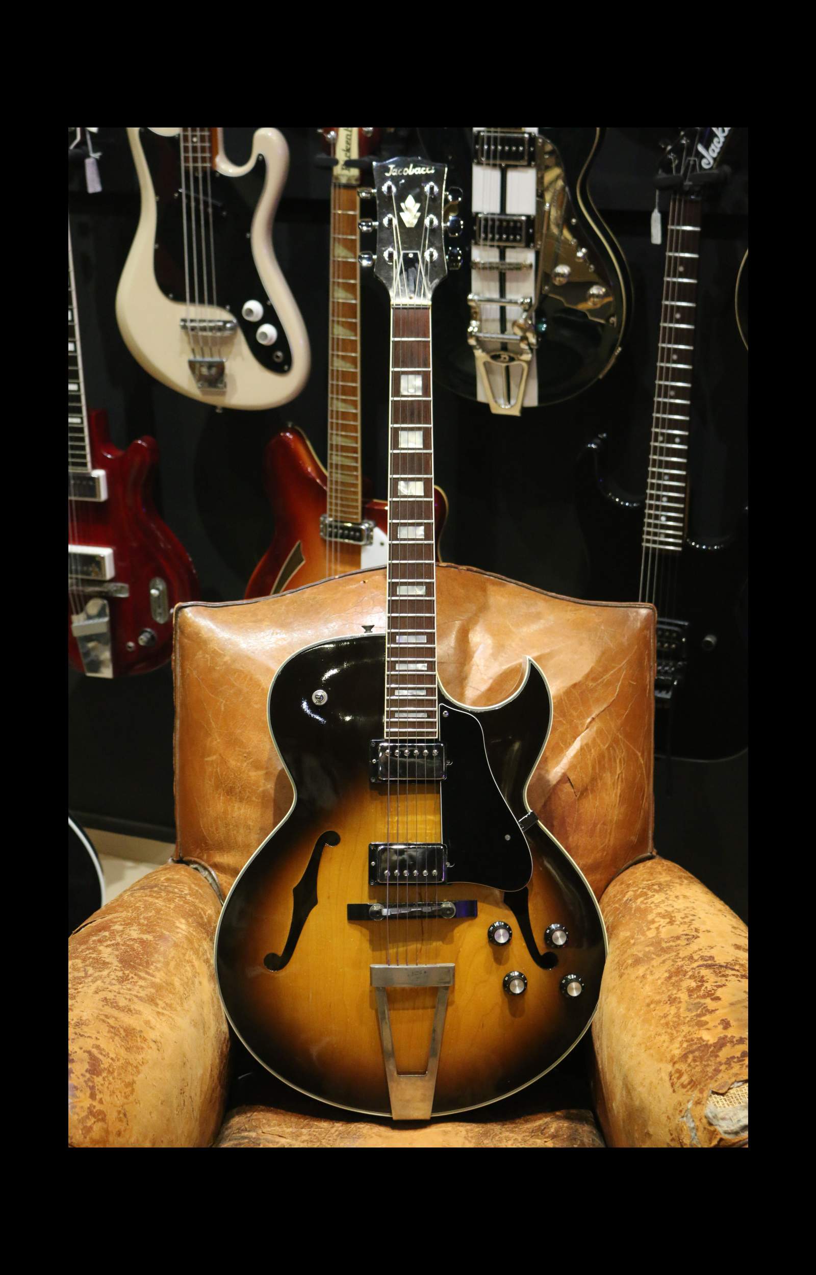 Le modèle Sacha Distel de Jacobacci est une guitare jazz électrique archtop emblématique, fabriquée artisanalement à Paris à partir de 1966 en collaboration avec le musicien Sacha Distel !