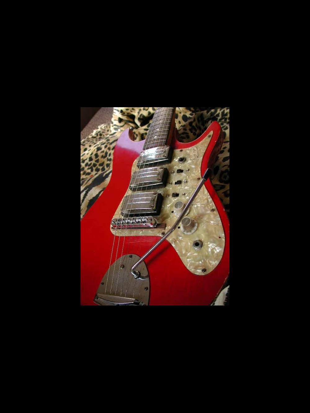 Egmond Electra 2, soeur jumelle de la Tympoon, elle est des années 1960 et a encore un scellé de douane de 1963 attaché sur le manche. Ecoute la bande son.