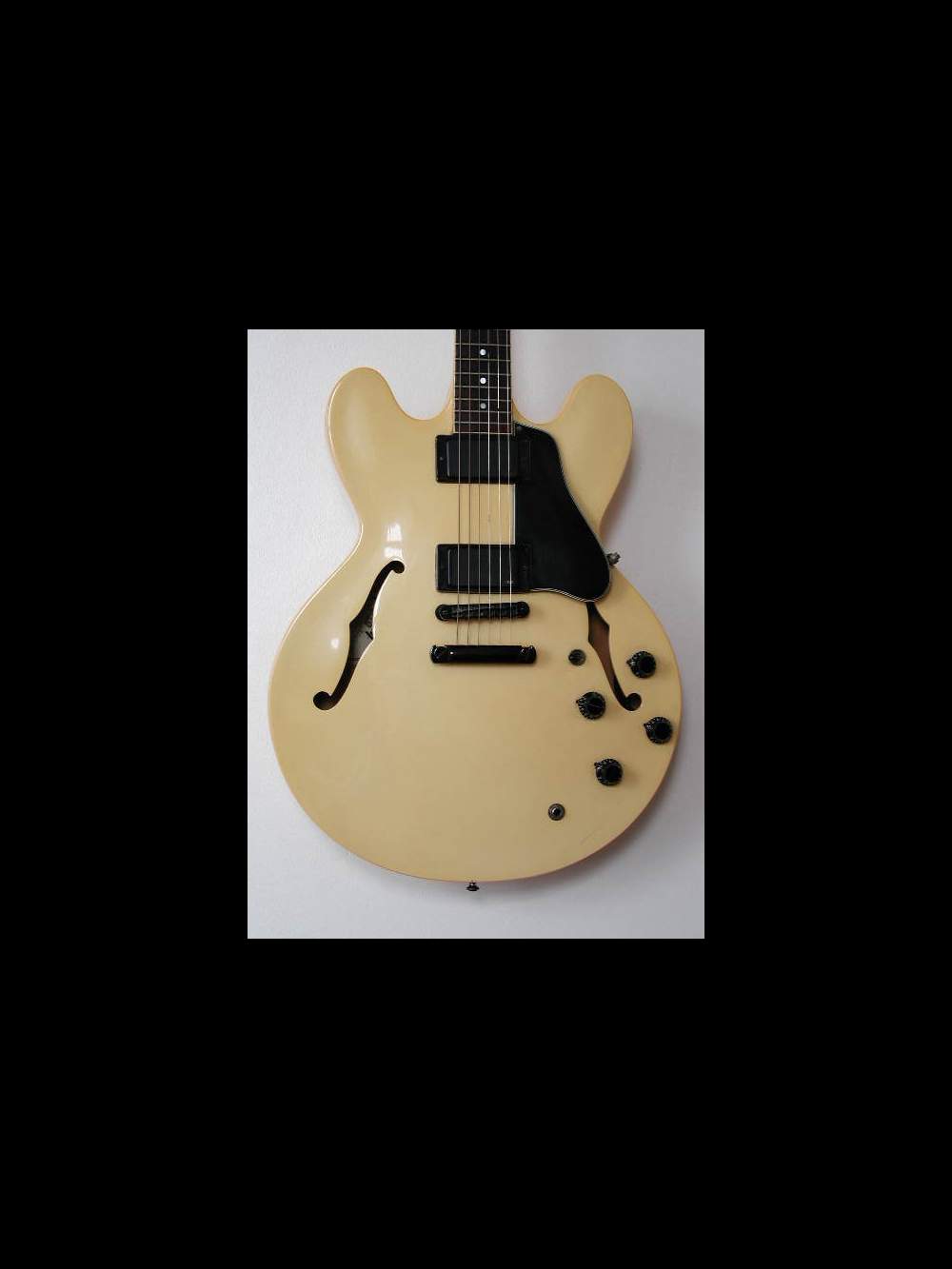 Cette Gibson ES 335 Showcase Edition a été produite uniquement en 1988. Ce modèle de 335 Gibson a été sorti en très petit nombre (250) et avec micros EMG d'origine pour répondre aux lois du marché de l'époque (1988). L'électronique est ACTIVE, ce qui lui donne d'abord une puissance sans égale et un rapport signal bruit très bas : aucune ronflette n'est perceptible. Le modèle présenté ici est encore plus rare car la ES335 blanche n'a été sortie qu'en 2 exemplaires. Ecoute la bande son.