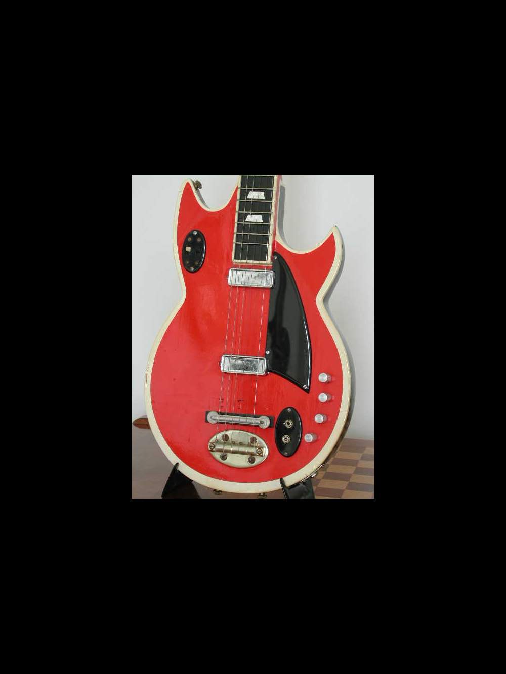 Très jolie petite guitare solidbody des années 55/60. Le look est soigné, malheureusement, aucune marque dessus. Je pense qu'il s'agit d'un prototype de jeune luthier, et j'espère qu'il reconnaitra son travail pour nous donner plus d'information. italien peut etre si on regarde les couleurs, mais affaire a suivre. En dehors du look, il n'était pas surdoué en soudure notre artiste. La guitare est bien cablée puisqu'elle fonctionne en tapant dessus, mais les soudures c'est un désastre. Il devait soudé avec les pieds ou alors il tremblait terriblement. C'est bourré de faux contacts. j'ai tout laissé en l'état en attendant que notre jeune luthier vienne assurer l'après vente. Pas de bande son, because ci dessus.