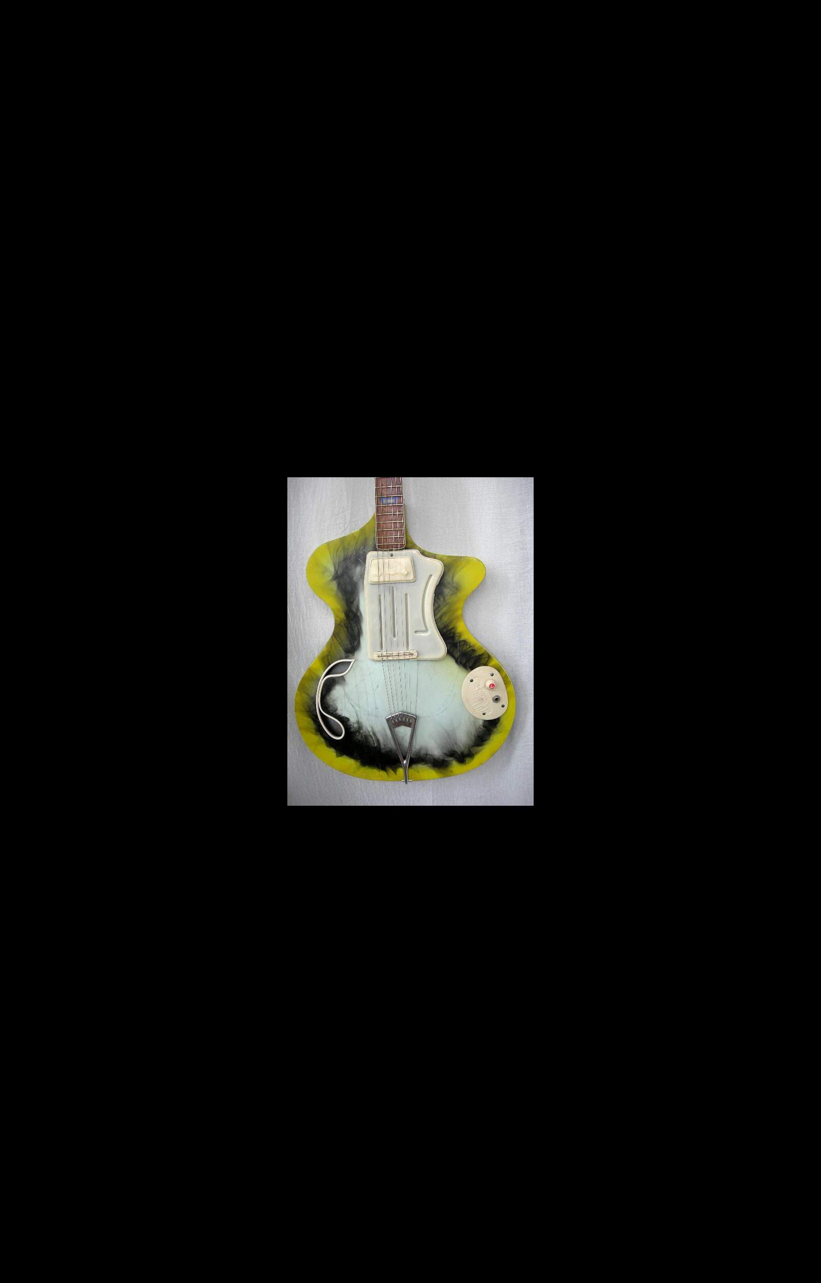 Superbe Wandré Waid qui date de la fin des années 1950. Encore une guitare signée Wandré qui est une oeuvre d'art en plus d'etre un instrument de musique. Cette guitare a échapée de peu à une transformation en violon, en effet, on voit encore les traces de marquage sur le body de la forme violon qui devait etre découpée avec le corps. heureusement que j'ai trouvé cette guitare avant que le luthier soit passé à l'acte. Ecoute la bande son.